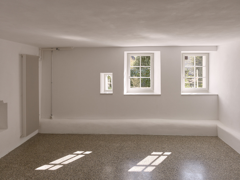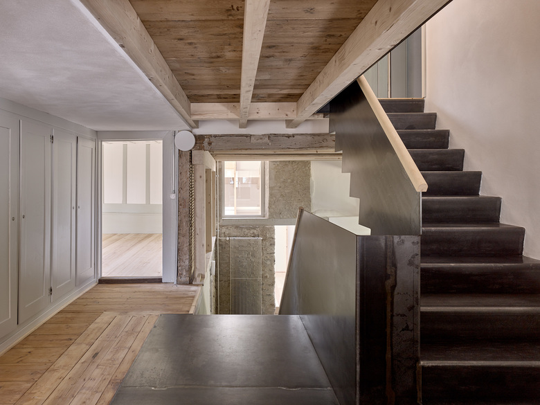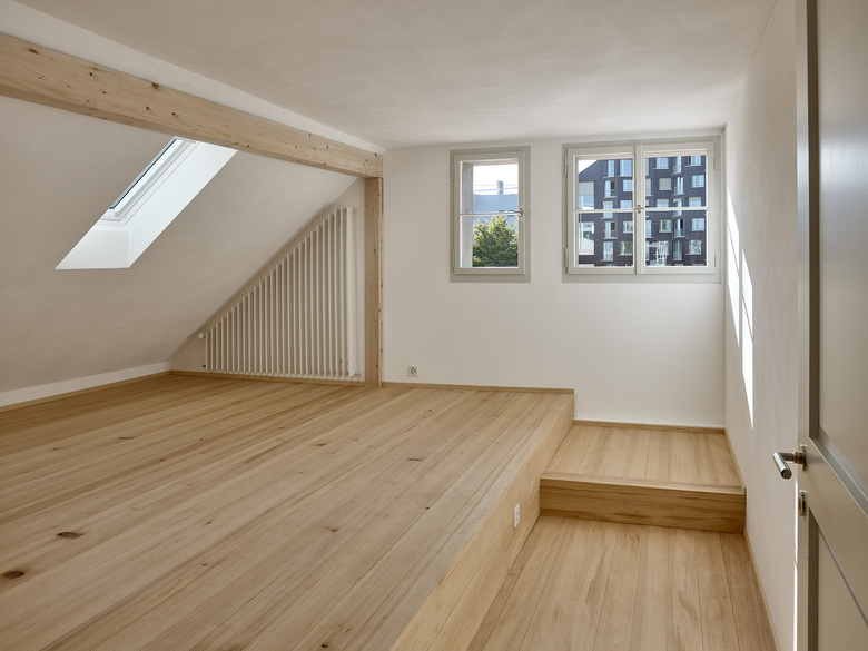 Das Gebäude ist vor der Instandsetzung durch Um- und Einbauten stark verunklärt. Insbesondere auf seiner Nordseite im Erd- und Obergeschoss ist die ursprüngliche Struktur des Gebäudes kaum mehr zu erkennen; war dieser Gebäudeteil ursprünglich leergeräumt und Standort der grossen Baumtrotte? Die Eingangssituation, die Wegführung und die Verbindung zum westseitigen Anbau wirken beengend und labyrinthisch. Durch Öffnen des Raumes - Rückbau der Einbauten inklusive Zwischendecke - und Umplatzierung der Treppe ins Obergeschoss, beginnt das Haus zu ‘atmen’ und es entsteht eine selbstverständliche Verbindung ins Hinterhaus und in den neuen Anbau.