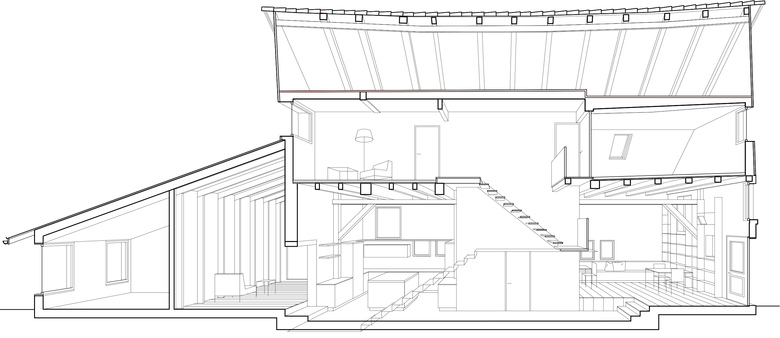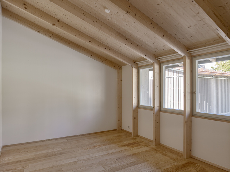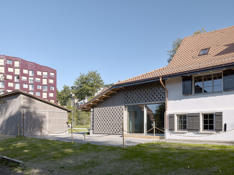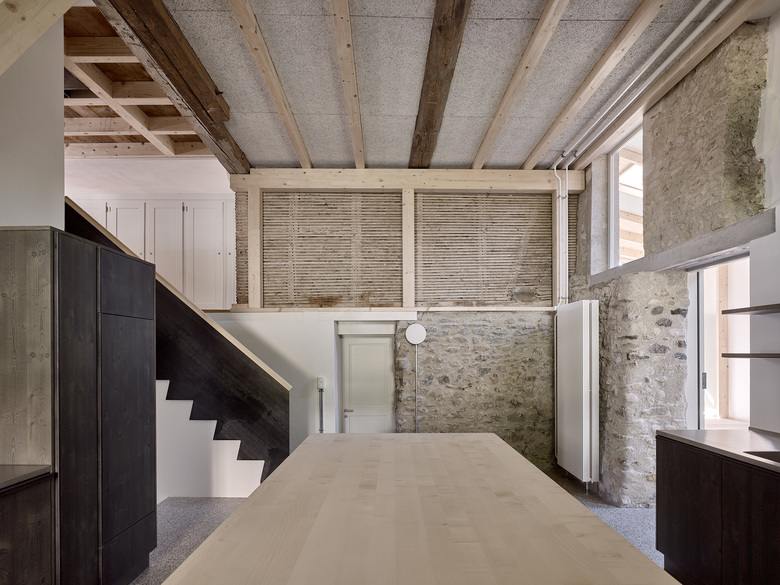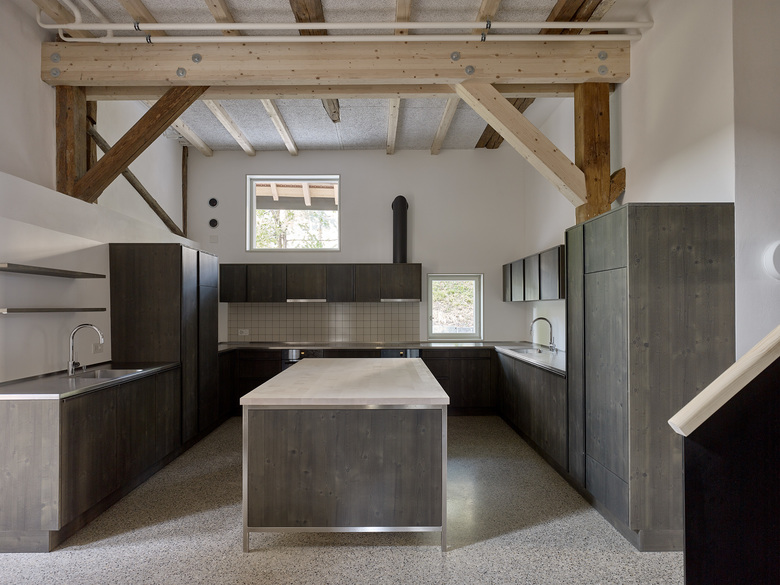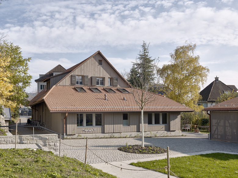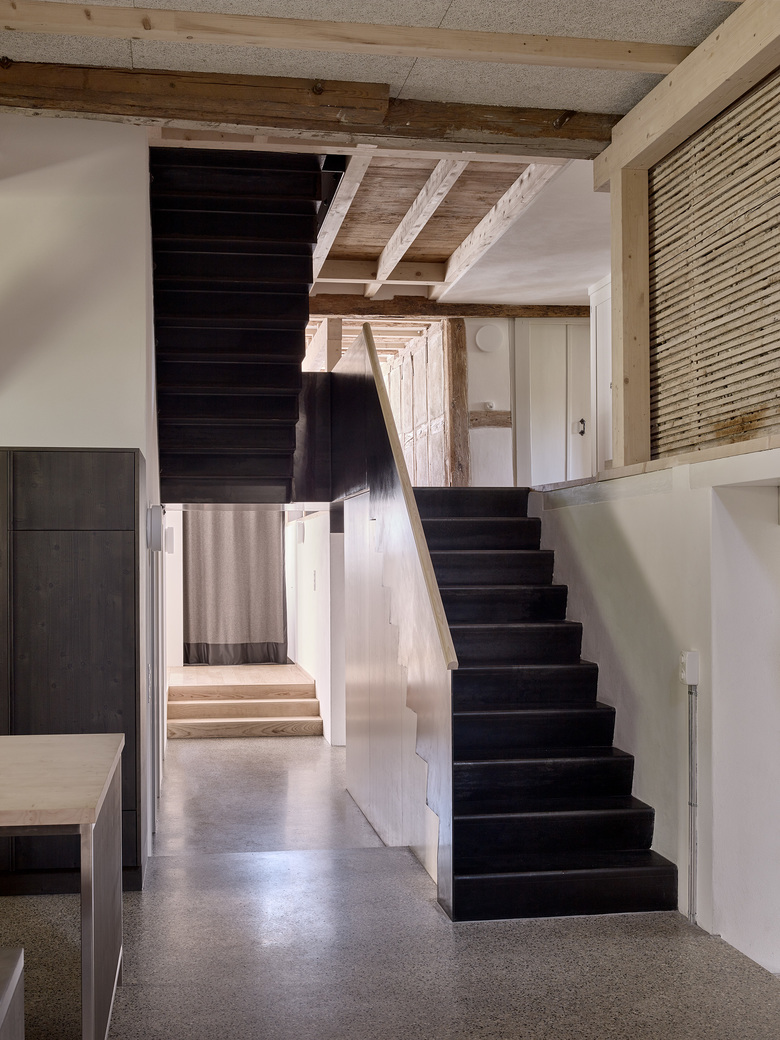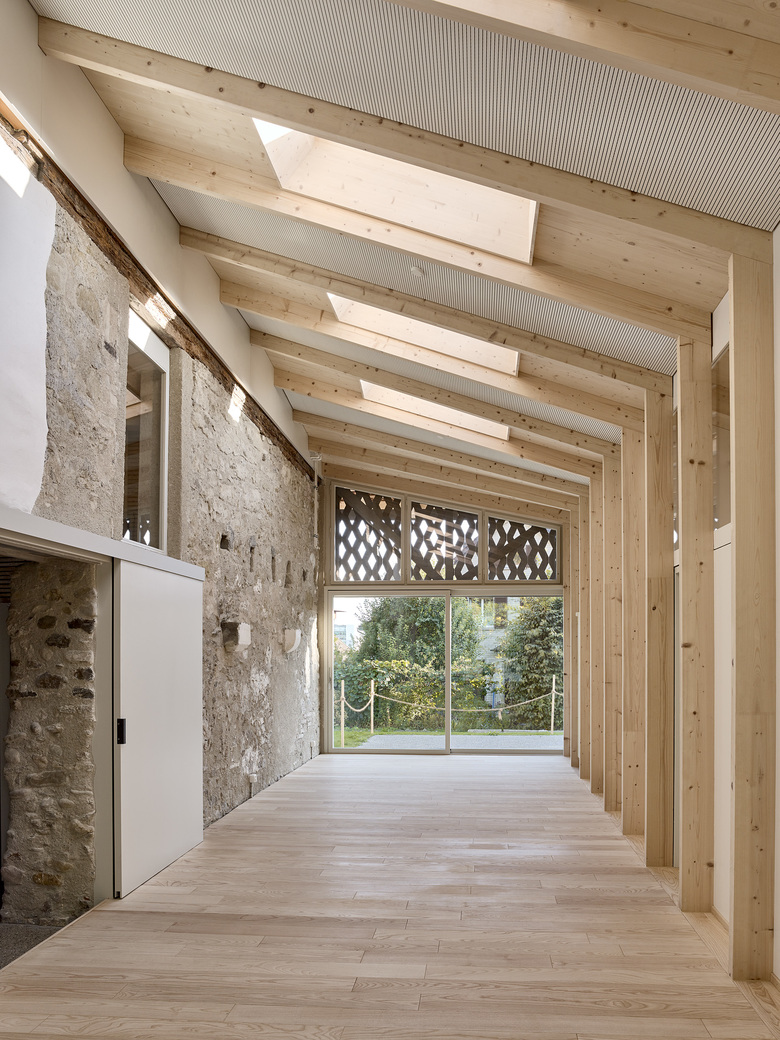 Die Gegenüberstellung und Symbiose von Massivbau und Holzkonstruktion, der introvertierten Kammern mit kleinen Fenstern und der grosszügigen Gemeinschaftsräume mit Verbindung untereinander und zum Garten, von bestehenden und neuen Elementen und Bauteilen, prägen den räumlichen und materiellen Charakter des Gebäudes. Die Ausformulierung von Küche und Essraum steht stellvertretend für die zwei Gesichter des Hauses.