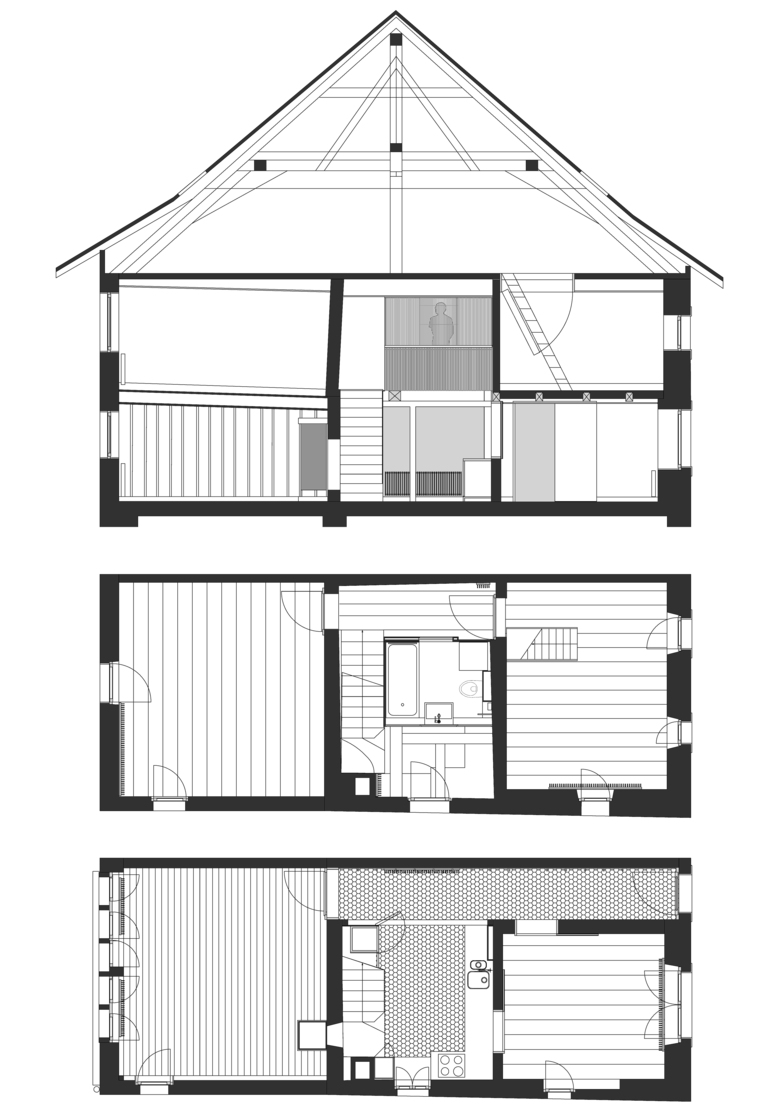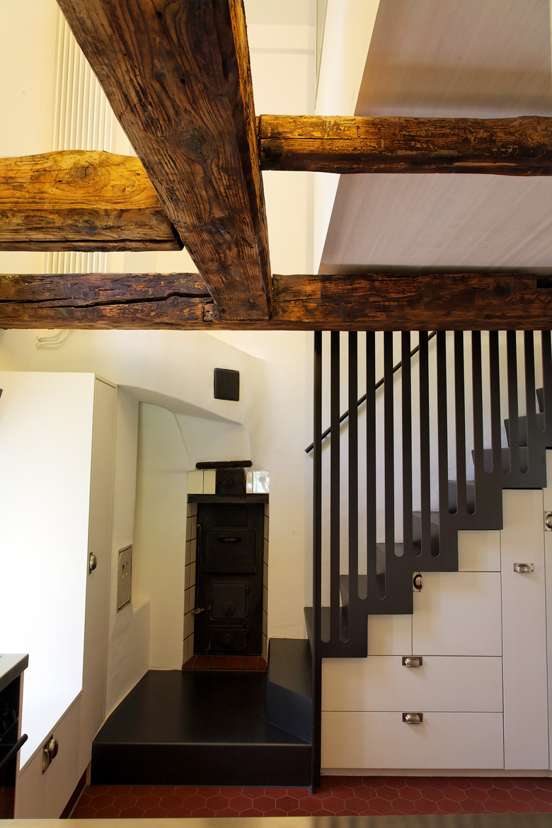 Ein verwunschenes Flarzhaus aus dem 16. Jahrhundert zeugt von den früheren Lebensbedingungen armer Leute. Sein Umbau ermöglichte zeitgemässes Wohnen in einem ganz besonderen Umfeld. Der Architekt Lukas Felder brachte Licht und Gestalt in die abgewohnten Räume. Beim Umbau verfolgte der Architekt das Ziel, in dem alten Haus ein zeitgemässes Wohnen zu ermöglichen. Den Weg dazu bahnte er sich durch typologische Studien und eine gründliche Untersuchung des bestehenden Baus. Der wichtigste Eingriff betrifft die Gebäudemitte: Die Wand zwischen Küche und Gang wurde entfernt und die Treppe ins Obergeschoss versetzt. Küche, Gang und Treppe wurden durch diese Öffnung zu einem offenen und hellen, zweigeschossigen Raum. Die neue Treppe ist als raumhaltiger, tragender Körper aus massivem Stahlblech gestaltet. Sie trägt im Obergeschoss den galerieartigen Einbau des Bades, das vom Luftraum über der Küche Tageslicht erhält. Seine Form ist ohne Anbiederung modern. Eine fensterartige Öffnung verbindet die Küche mit dem benachbarten Raum im Norden, der dadurch zum Esszimmer wurde. Die neu eingebrachten Materialien wurden analog zu der jahrhundertealten Bausubstanz naturnah und dauerhaft ausgewählt: Keramikplatten in der Küche und im Gang, helle Riemenböden aus Tanne in den Zimmern, Kalkputz für die Wände.