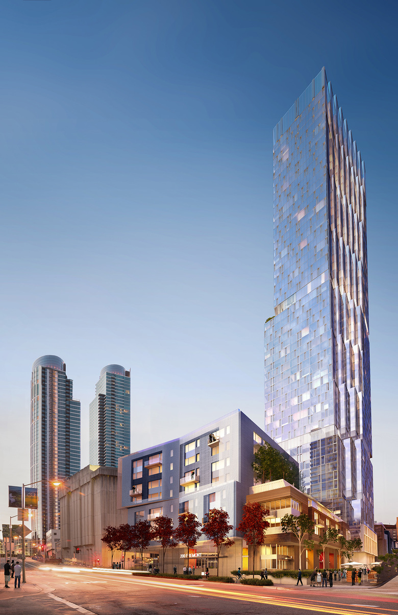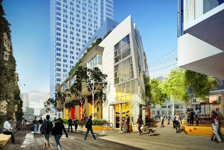 The Folsom Street side of Block 8 is filled with retail shops and residential lobbies creating active edges as well as porosity around and through the site. The porosity is further enhanced with the paseo. At the podium level, the buildings flanking either side of the paseo gently slope back to enable more light and air and invite Block 8 residents and any neighbors to wander into the open space. On Fremont, the folding planes of the podium building along with the dynamic massing along Folsom Street create a lively streetscape and playful podium.