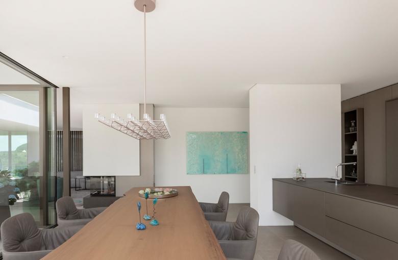 Das Exterior ist maßgeblich geprägt von der großflächigen Öffnung der Südseite. Horizontale Bänder, abwechselnd in weißem Putz und dunklem Aluminium, halten die drei Ebenen optisch zusammen und lassen das Haus trotz kubistischer Formgebung aus allen Blickwinkeln leicht und elegant wirken.