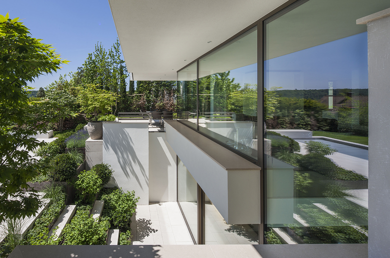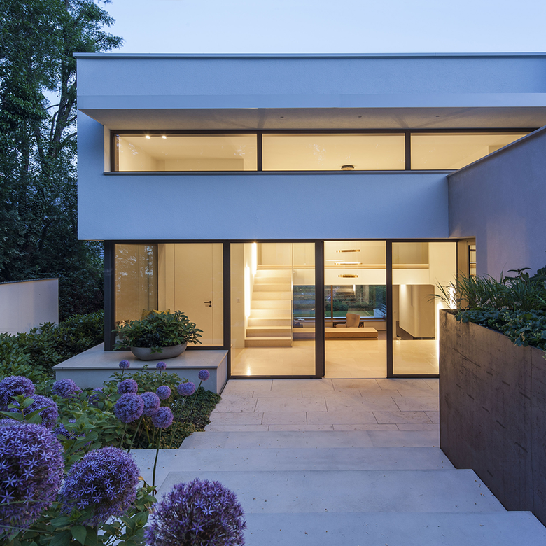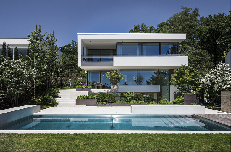 Die Fassade in weißem Glattputz wird je nach Lage und Ausrichtung großflächig von raumhohen Fensterelementen durchbrochen.