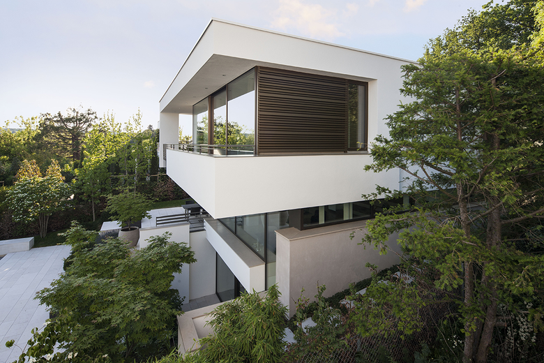 Das Einfamilienhaus befindet sich in bester Stuttgarter Südhanglage mit wunderschönem Panoramablick. Mehrere Teilkuben gliedern den quadratischen Baukörper, welcher nach Süden hin, durch das eingerückte, vollverglaste Erdgeschoss einen schwebenden Eindruck bekommt.