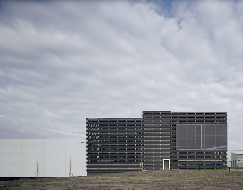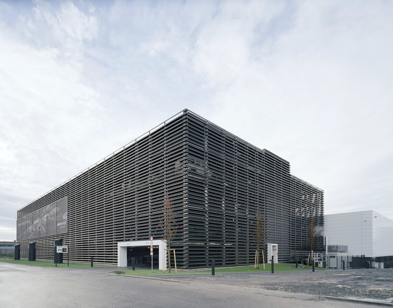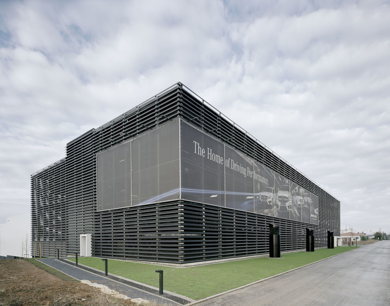 Äußerlich fügt sich das Gebäude in das Corporate Design von Mercedes-AMG ein. Mit der Fassade aus schwarzen Lamellen bildet es den Kontrast zum angrenzenden Logistikzentrum mit seiner weißen Fassade, ebenfalls im CI von Mercedes-AMG gehalten.