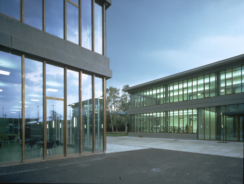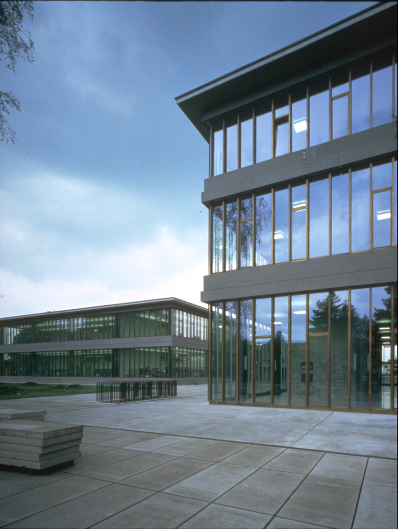 Die in einer parkähnlichen Umgebung liegende Anlage der Hochschule wird mit zwei Neubauten ergänzt. Diese sind in Anlehnung an die Struktur der bestehenden Gebäude aus den siebziger Jahren als Pavillontypen mit Skelettkonstruktion und transparenter Vorhangfassade ausgebildet.