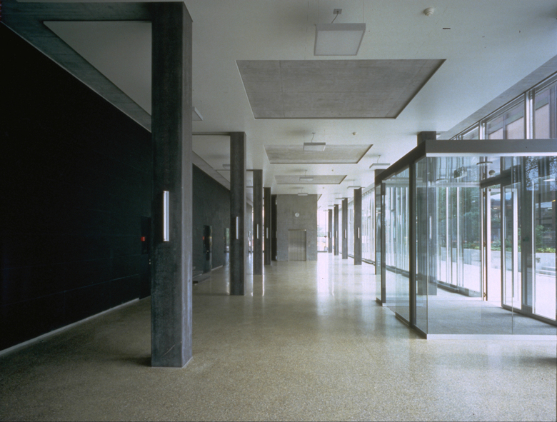 Das zentrale "Foyergebäude" formuliert eine neue Mitte innerhalb der gesamten Anlage. Hier sind die Bereiche mit einem erhöhten Öffentlichkeitsgrad, wie Hörsäle und Mediathek, untergebracht. Die Lage der Hörsäle im Erdgeschoß und der darüberliegenden Mediathek erzeugen eine räumliche Verdichtung des Gebäudes zur Mitte hin. Das eher peripher am See gelegene neue Unterrichtsgebäude beinhaltet überwiegend hochschulintern genutzte Bereiche, wie z.B. Labors, Klassenräume und Zeichensäle. Als Analogie zu dem bei den bestehenden Bauten verwendeten Cortenstahl wird als Material für die Fassaden Baubronze eingesetzt, die resistent gegen Flugrost ist und zudem nicht beschichtet werden muss.