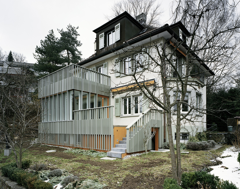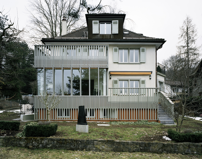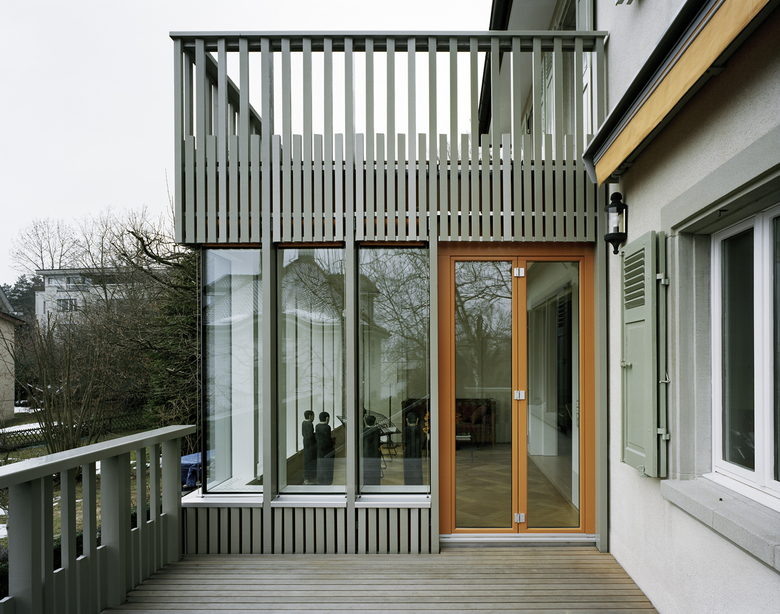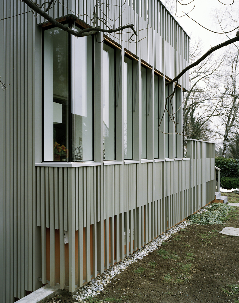 Das neu angebaute Gartenzimmer und die angrenzende neue Terrasse sind in Proportionen und Farbe so gehalten, dass eine ausgeglichene Volumetrie mit dem bestehenden Haus erzielt wird. Der Anbau wurde als Holzständerkonstruktion in Elementbauweise errichtet und mit vertikalen Latten für die Fassadenverkleidungen und Brüstungen versehen. Die unterschiedlichen Farben von Lattenverkleidung und Hintergrund sorgen für Leichtigkeit. Die Lattung verdichtet sich im Bereich der Böden und vor den Deckenstirnen und weitet sich vor dem Sockel, an den Brüstungen und vor den rahmenlosen Fenstern aus.