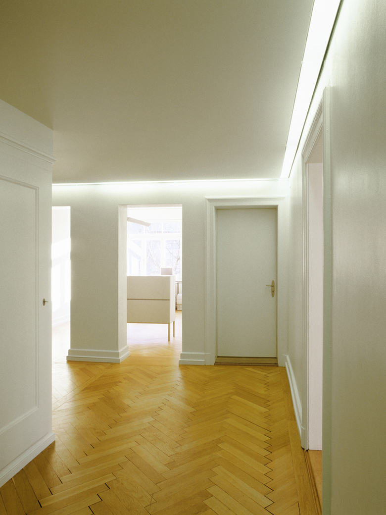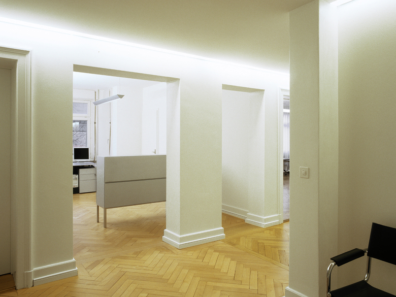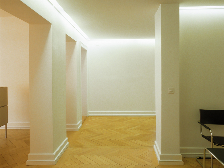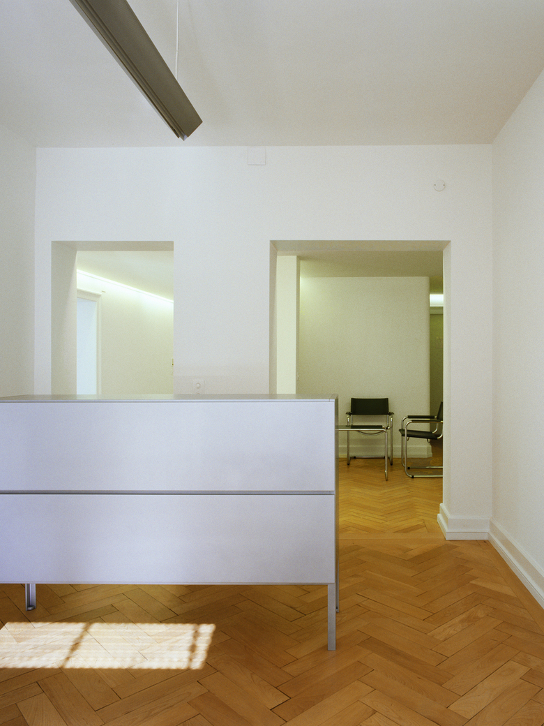 Die Einbauten, textilen Bodenbeläge, Wand- und Deckenverkleidungen werden überall entfernt, um den ursprünglichen Zustand hervorzuholen und um die Grosszügigkeit der Räume zu betonen. Der architektonische Eingriff konzentriert sich auf den öffentlichen Bereich: Zwei grosse Öffnungen verbinden den Eingang, Wartebereich und Empfang. Das Tageslicht dringt weit in den Erschliessungsbereich herein. Ein in die Decke eingebautes Beleuchtungsband führt den Besucher spiralförmig vom Eingang zum Empfang hin. Streiflicht fällt auf die mit leichtem Perlmuttglanz ausgestatteten Wandoberflächen herab.