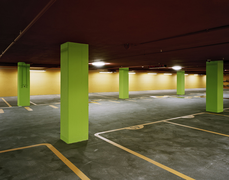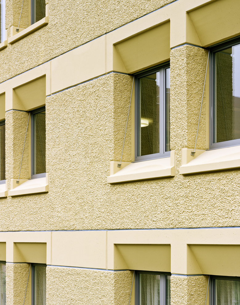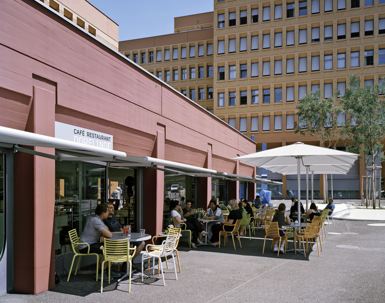 Die drei Publikumsebenen der Anlage sind in ihrer Wirkung gestärkt und über neue grosszügig angelegte Treppenanlagen besser miteinander verbunden worden: Der Garten wird verdichtet, der Platz auf Strassenniveau dagegen räumlich geöffnet und das unterirdische Parkhaus besser in den öffentlichen Raum miteinbezogen. Die einheitliche neue Farbgebung beruht auf dem ursprünglichen Farbkonzept und lässt mit dem neuen Goldschimmer auf den groben Putzflächen und im Zusammenwirken mit weiteren gestalterischen Massnahmen die massigen Dorflindebauten wesentlich leichter und zeitgemässer erscheinen.