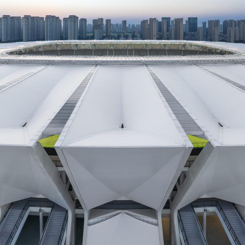 Die ovale Form des Stadions wird durch 36 robuste Doppelrahmen aus Ortbeton gebildet, die von filigranen Stahlfachwerkbindern überspannt werden. Das elegante skulpturale Tragwerk entstand in Kooperation mit schlaich bergermann partner (sbp). Zwischen den Doppelrahmen sind transluzente Membranen aufgespannt. Sie leiten Tageslicht ins Innere und fungieren zugleich als Fassade und Dachhaut. Mit einer Fläche von rund 600 Quadratmetern pro Membranelement handelt es sich um die größte einlagige Membranstruktur in China. Ein außenliegendes Brückensystem ermöglicht eine schnelle und reibungslose Erschließung: Breite Treppen führen die Zuschauenden auf ein umlaufendes Podium und von dort aus über 48 Brücken auf die oberen und unteren Ränge der Tribünen. Dass die Personenströme so effizient geleitet werden, wurde bereits beim Eröffnungsspiel erfolgreich unter Beweis gestellt.
