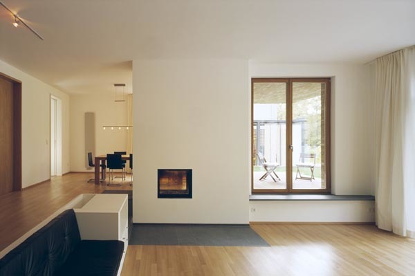 Raumhohe Fensterflächen nach Südosten und Südwesten fangen im Erdgeschoß das Sonnenlicht ein. Das Wohnzimmer ist durch einen Niveauvorsprung gegliedert.
