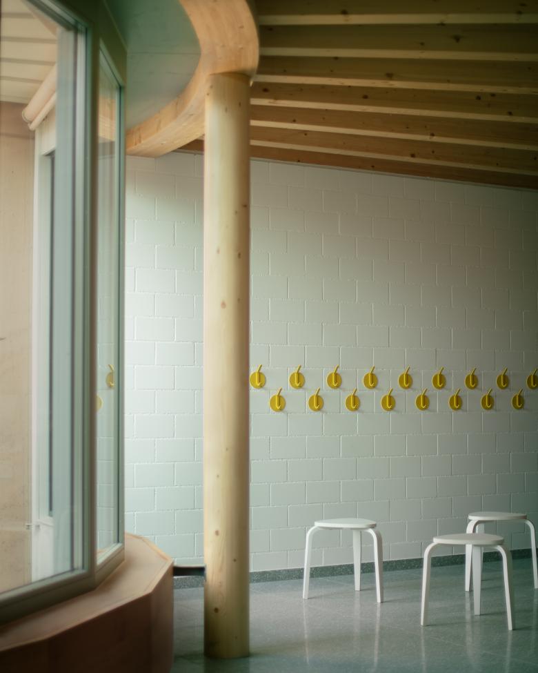 Das Holztragwerk des Daches schafft in den Unterrichtsräumen eine warme Atmosphäre und nimmt in den Zwischenräumen die Leuchten auf. Einzelne Elemente wie Schränke, Kleiderhaken und die Fenster werden farbig behandelt und werden damit bewusst von den weissen Wänden und dem Holztragwerk abgelöst.
