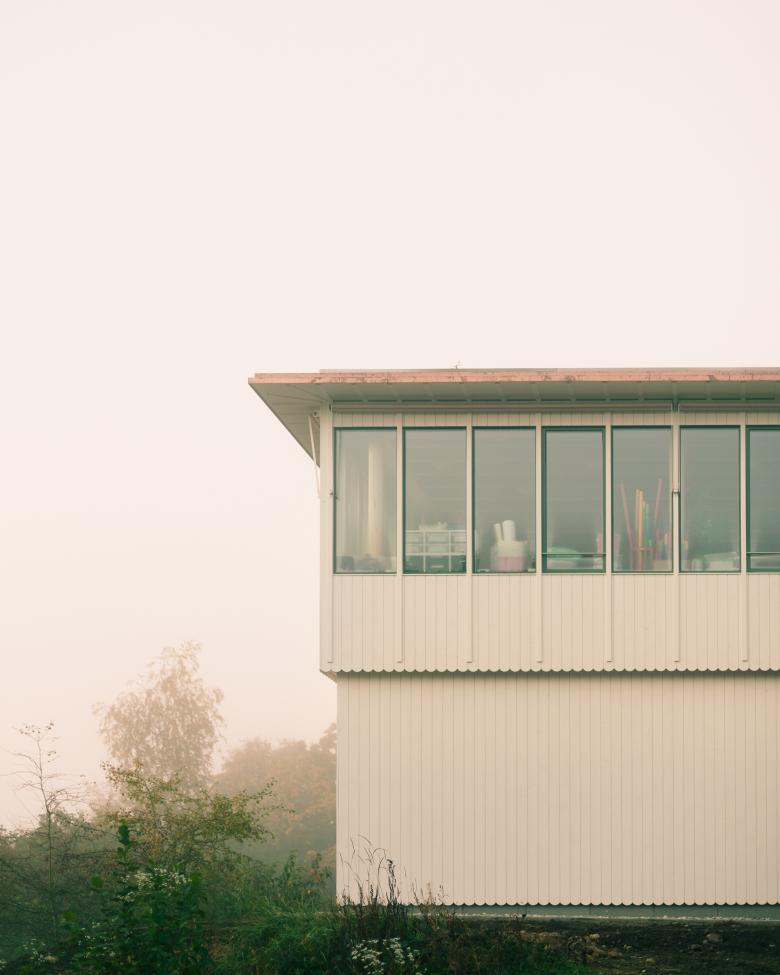 Der Rücksprung im Erdgeschoss und die Stapelung der unterschiedlichen Nutzungen zeichnet sich in der Fassade ab. Das obere Geschoss springt leicht vor und weisst eine kleinteiligere Befensterung und Gliederung auf. Die Fassade wird bewusst dünn gehalten, ist sehr präzise gefügt und wirkt fast wie Papier.