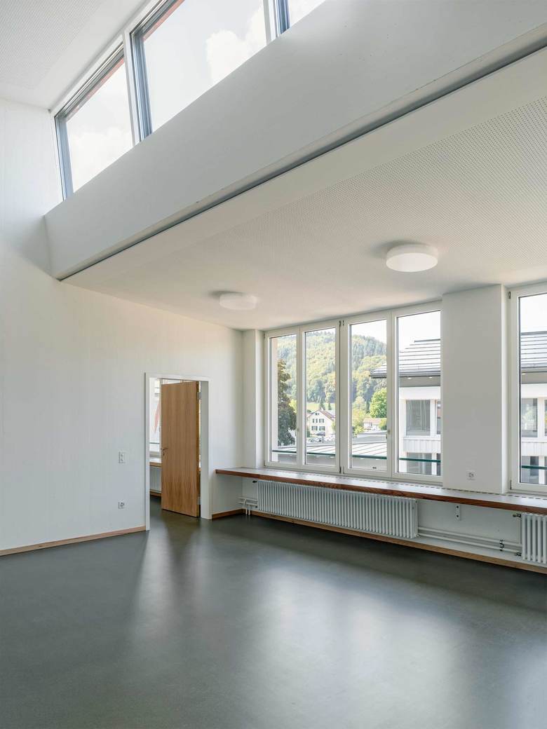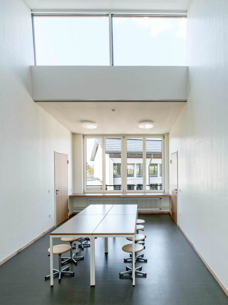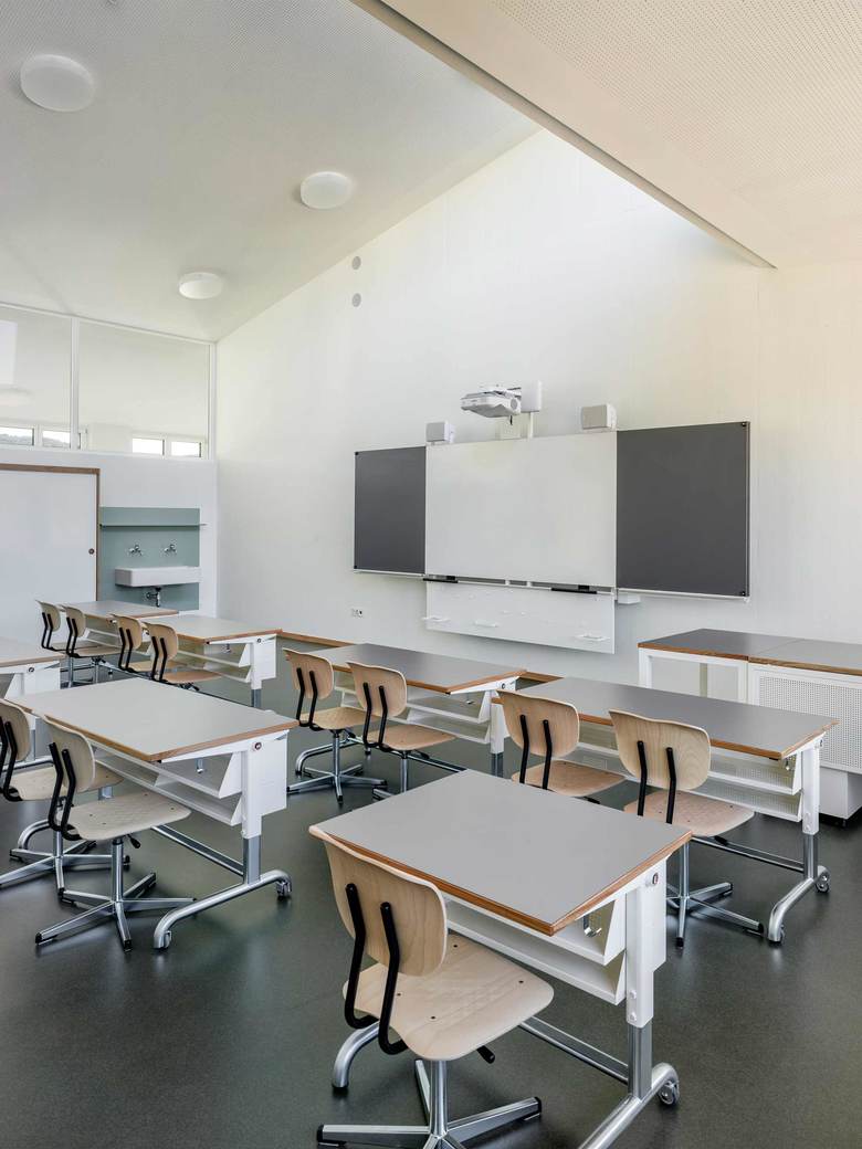 Die Grundrisstypologie des zweigeschossigen Gebäudes entwickelt sich aus dem Bestand heraus. Pro Stockwerk sind jeweils vier Schulzimmer entlang eines breiten Korridors angeordnet. Zwischen den Schulzimmern eingefügte Gruppenräume brechen den Korridor auf und eröffnen spannende Querbezüge. Mittels des überhohen Erdgeschosses und der gefalteten Dachfigur werden so alle Räume optimal belichtet.