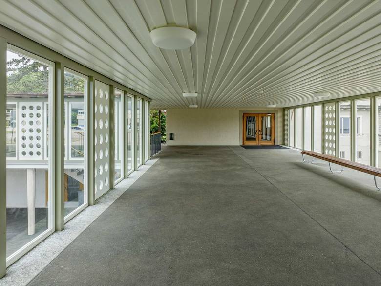 Der Fingerbau ist mineralisch verputzt. Die Textur und Farbigkeit der Putzflächen orientiert sich am Bestand und ist in hellen Grau-, Beige- und Weisstönen gehalten. Dunkelgrüne Holz-Aluminium-Fenster setzen einen Akzent. Das zenitale Tageslicht prägt die hell gestalteten Innenräume.