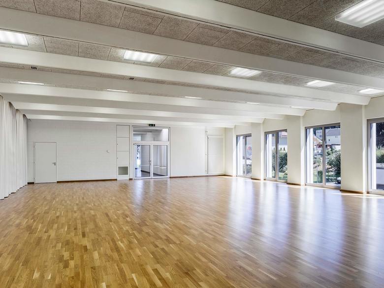 Mit der Verwendung von Weisszement für die Betonelemente erhält der Neubau ein helles Erscheinungsbild und fügt sich trotz seiner prominenten Lage gut ins Dorfbild ein. Die filigranen Lisenen sind einerseits statisch bedingt, bilden jedoch auch das Raster der Tragstruktur nach aussen rhythmisch ab. Die Flächen der Elemente sind sandgestrahlt, um einen feinen Kontrast zur Lisene zu schaffen. Im Innern wird die filigrane Rippendecke freigelegt und mit akustisch wirksamen Zementholzwollplatten ausgefacht. Kombiniert mit den grauen Kunststein- und den ockergelben Sportböden ergibt sich eine ruhige, entspannte Stimmung.