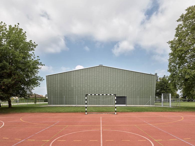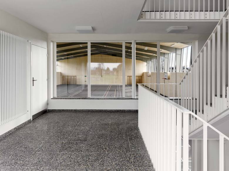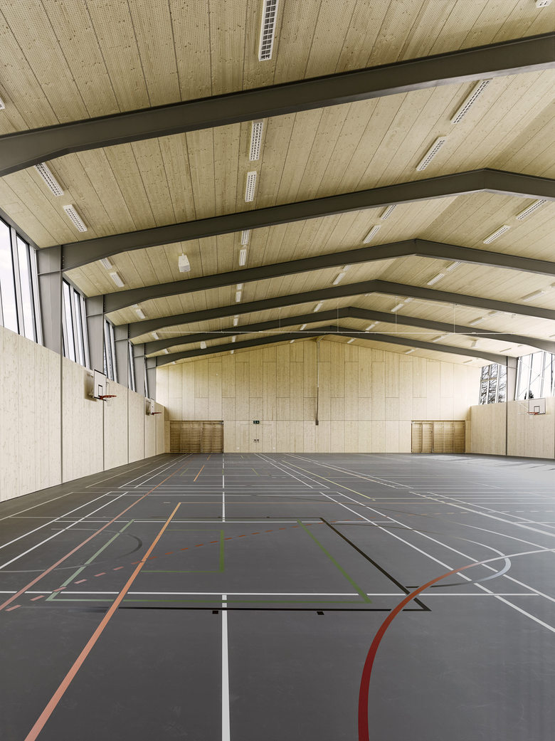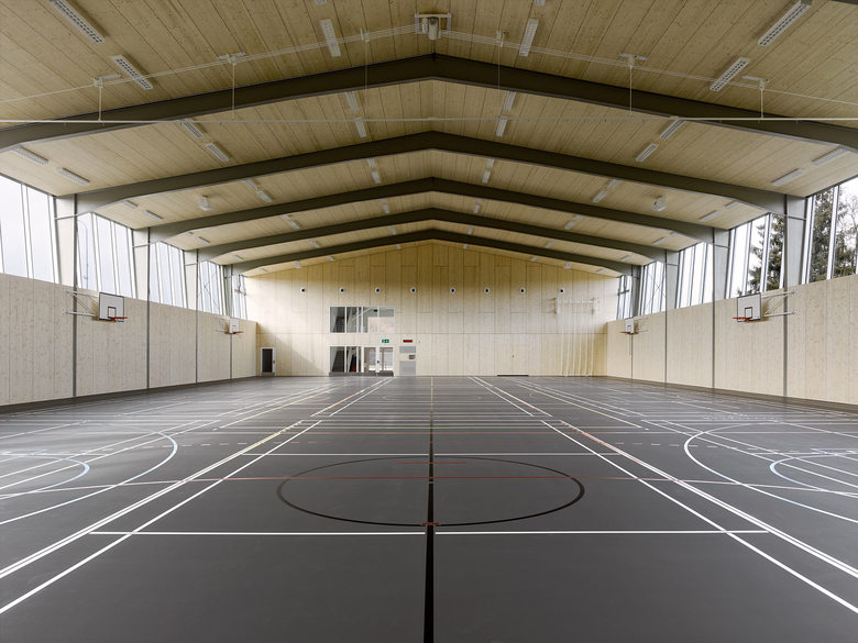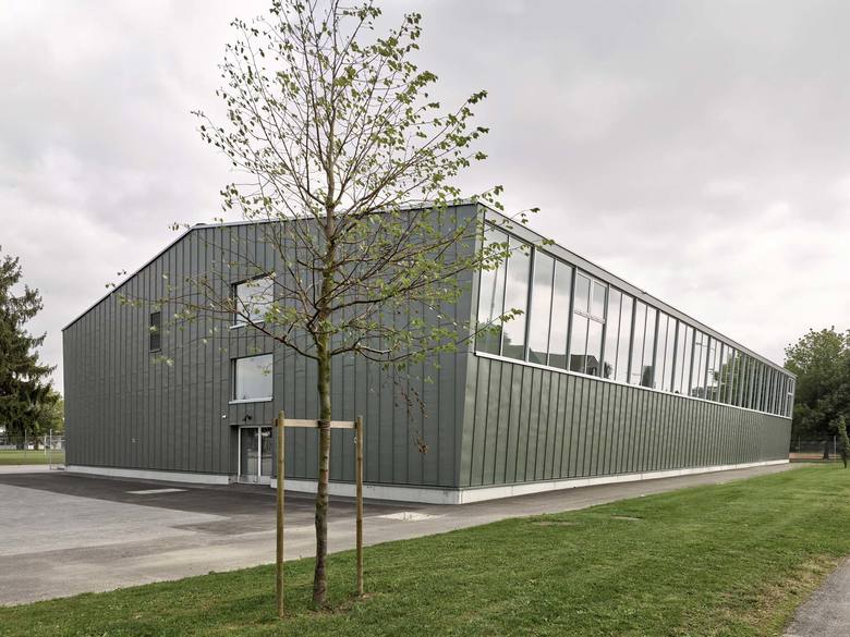 Gedacht als eine dünne papierartige Haut, wurde die Fassade vor Ort vom Spengler von Hand aus Titanzinkblech erstellt. Präzis gefügt und detailliert gestaltet umspannt die neue Stehfalzfassade die bestehende, nach aussen geneigte Stahlkonstruktion. Die Fichten-Dreischichtplatten und der lackierte Stahl kombiniert mit dem dunkelgrauen Sportboden prägen als einfache, robuste und haptische Materialien die Atmosphäre der Halle. Über die vergrösserten längsseitigen Fensterbänder fällt viel Tageslicht in den Raum. Sämtliche Installationen sind in weisser Farbe ausgeführt, präzis gesetzt und sind, wo nötig, neu entwickelt.