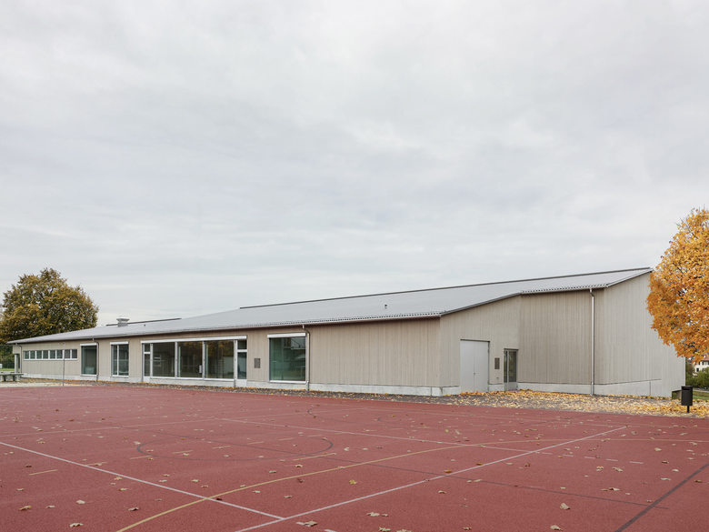 Nach dem Umbau kontrastieren grosse Glasflächen die präzise ausgeführte Holzfassade, die mit einem feinen silbrigen Wellblechdach kombiniert wurde. Im Hallenraum schaffen die weiss gestrichenen Betonflächen zusammen mit dem hellen Holz und dem dunkelgrauen Sportboden eine lichtdurchflutete Atmosphäre. Die Bausubstanz wurde soweit wie möglich belassen. Einzig der Mehrzweckraum mit anschliessendem Office sowie das Lehrerzimmer machten grössere strukturelle Eingriffe nötig.