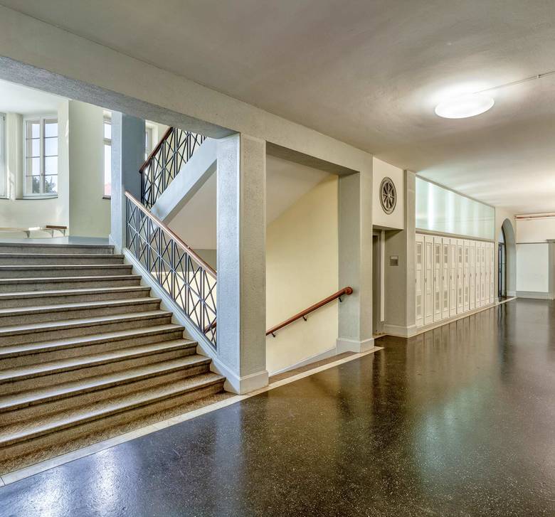 Die Fassade ist mit besonderem Augenmerk auf die denkmalpflegerischen Aspekte behutsam instandgesetzt worden. Alle unpassenden Fassadenelemente wurden entfernt. Die neuen Gestaltungselemente ergänzen den Bau im Sinne des ursprünglichen Bestandes. Auf eine nachträgliche Dämmung der Fassaden konnte aus Rücksicht auf die hochwertige Altbausubstanz verzichtet werden, da der Dachboden und die erdberührenden Böden nachträglich gedämmt worden sind. Die bestehenden Metallfenster sind durch gut gedämmte Holzfenster mit äusseren gekitteten Gläsern ausgetauscht worden. Der Ersatz der Rafflamellenstoren erfolgte durch filigrane Stoffmarkisen. Die beschädigten Sandstein- und Putzpartien (Kellenwurf) mussten nur punktuell restauriert werden. Die gesamte Farbgestaltung wurde nach den Originalfarben gehalten. Bei Elementen ohne erhaltenen Grundlagen erfolgte eine Interpretation in Rücksprache mit der Denkmalpflege. Die innere Tragstruktur musste erdbebenertüchtigt werden. Sämtliche Brandschutz- und Sicherheitsmängel sind behoben worden.