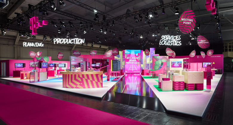Die Herausforderung bei der Präsentation: Komplexe Sachverhalte attraktiv, inspirierend und aktivierend darstellen. Das Standkonzept löst das durch interaktive und selbsterklärende Exponate, die digitalen Optimierungspotenziale exemplarisch für die Produktions-, Dienstleistungs- und die Logistikbranche erlebbar macht.
