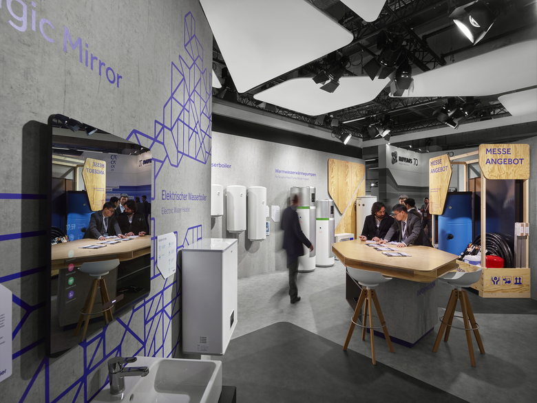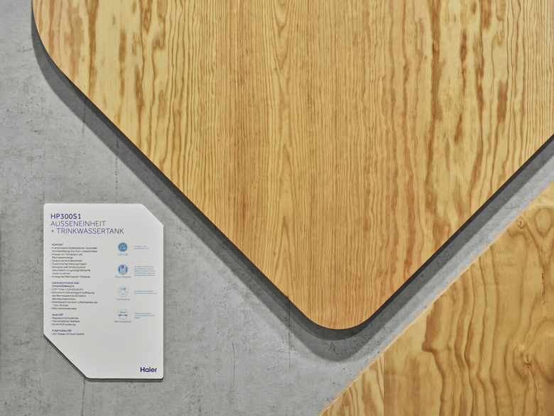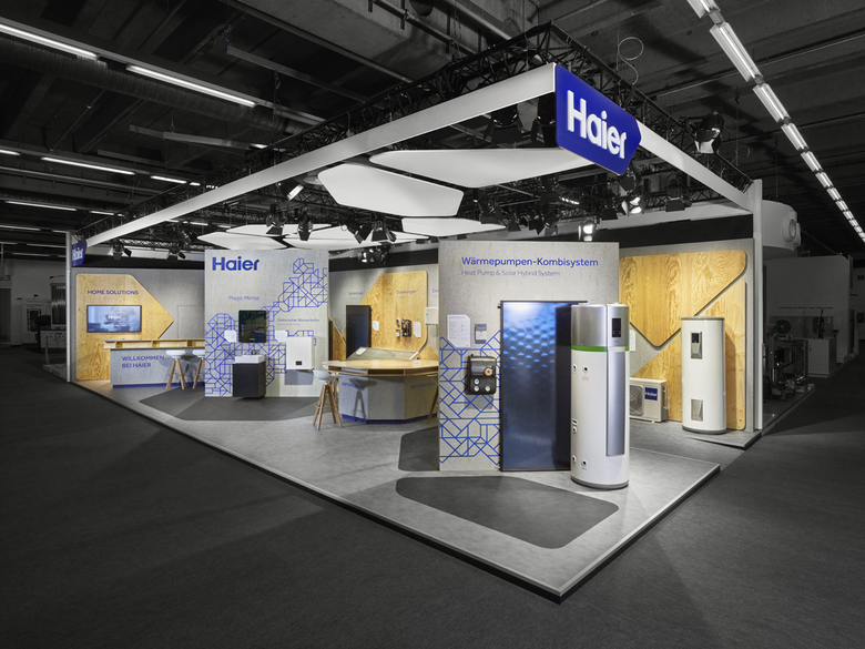 Verbindendes formales Element ist dabei das Haier Network Pattern – als Wand-, Boden- und Deckenelement bis zum Produktschild und Netzgrafik. Die Produktvielfalt an Kollektoren, Wärmepumpen, Speicher und Boilern werden in einer Line-Up systematisch gezeigt. Neuheiten, Kombisysteme und ein attraktives Messeangebot sind an freistehenden Wänden in den Vordergrund gerückt.