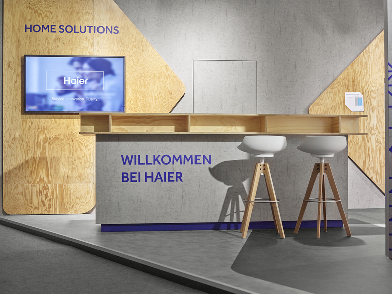 Der chinesische Multikonzern Haier zeigt auf der ISH in Frankfurt Lösungen für Solarthermie und Warmwassertechnik. Gemäß dem Motto „Nah am Kunden“ inszeniert hartmannvonsiebenthal Marke und Produkt in einem abstrahierten Baustellenumfeld aus Beton und Holz.