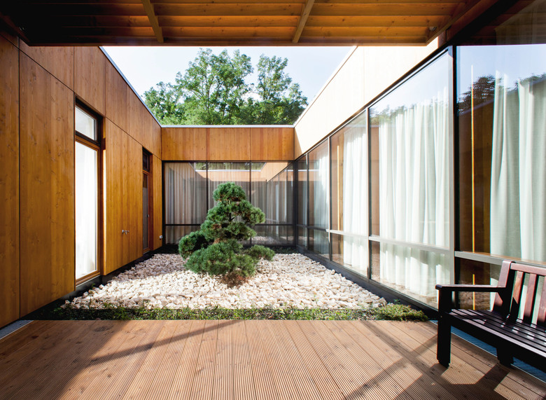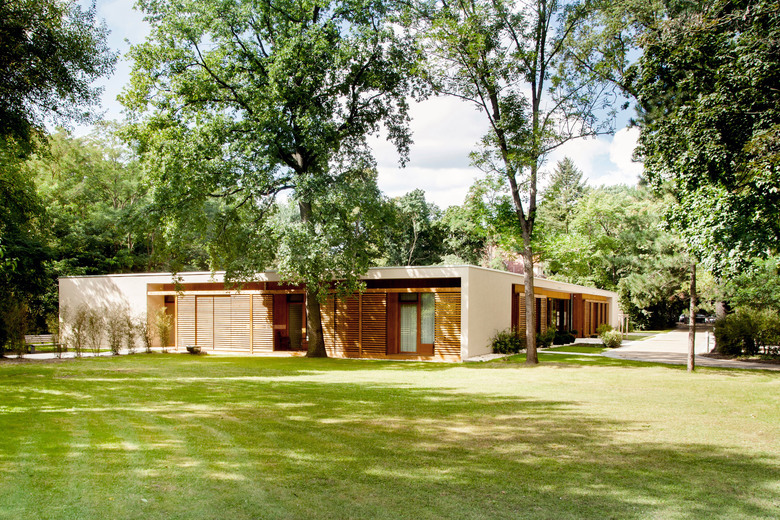 Die barrierefreien Einbettzimmer besitzen eine eigene Terrasse mit beweglichen Elementen aus Holzlamellen, die einen privaten Raum für jeden Patienten schaffen. Die Zimmer gruppieren sich um den zentralen Gemeinschaftsraum und einen geschützten Innenhof, in dem Gäste, Angehörige und auch Pflegekräfte zusammenkommen. Im Sinne des nachhaltigen Bauens wurde das Hospiz in Holztafelbauweise mit tragenden Außen- und Innenwänden errichtet.