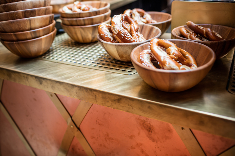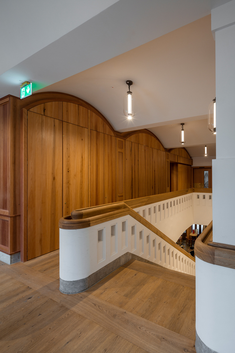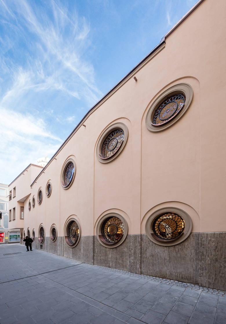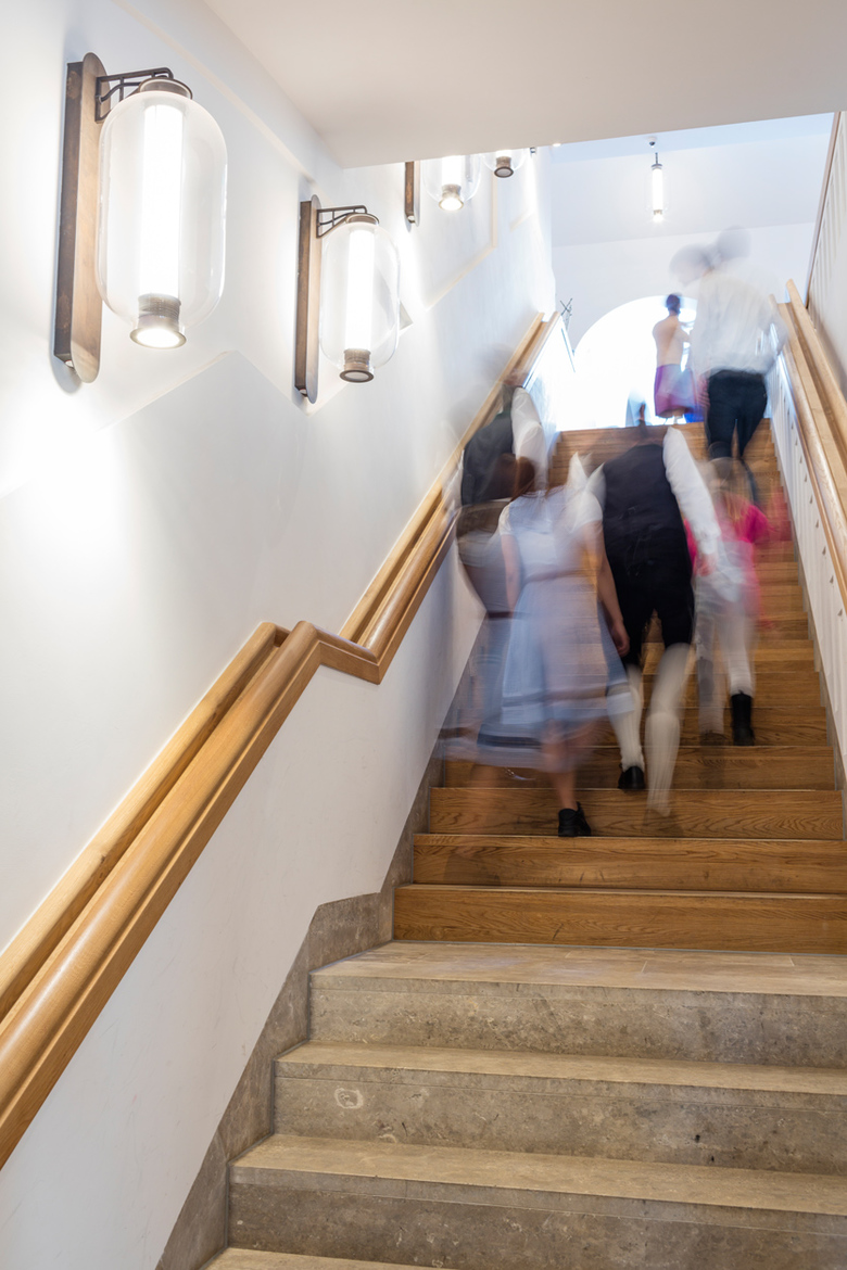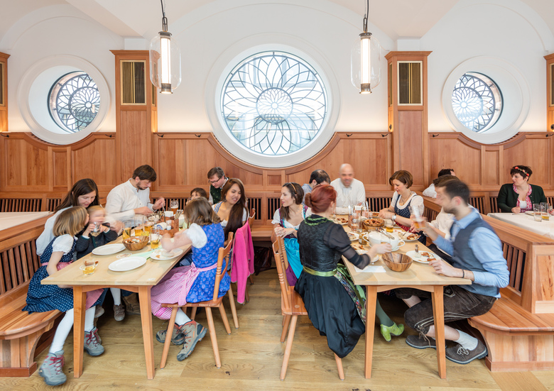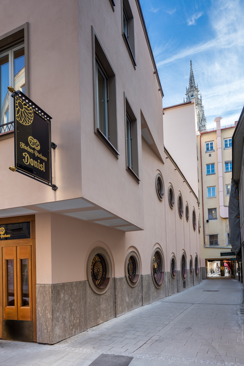 Die Festverglasung der Fenster ziert ein schmiedeeisernes Gitter, für dessen Gestaltung die Fensterrosen alter Kirchen Pate standen. Die Rosette ist so etwas wie das Wahrzeichen des neuen Donisl. Sie findet sich in Variationen und Fragmenten im ganzen Gebäude wieder: Unter anderem als Stuckornament im Gastraum, in den neuen Absturzsicherungen der Bestandsfassade oder auch in den Verglasungen der Innentüren. Diese sind wie auch die Holzvertäfelung, die festen Einbauten und die Stühle aus Birnenholz gefertigt. Die Tischplatten bestehen aus Ahornholz und die Böden wurden in Eiche oder in Naturstein ausgeführt. Insgesamt konzentriert sich der Innenausbau auf wenige, aber hochwertige Materialien. Häufig weisen diese einen regionalen Bezug auf, wie die einheimischen Hölzer oder der Wachenzeller Dolomit der Böden im Erdgeschoss. Alle Materialien werden – wie auch die Beschläge und Schankflächen aus Kupfer und Messing – mit der Zeit eine schöne Patina ansetzen. Der neue Donisl verbindet Tradition und Moderne, Bierkultur und großstädtisches Flair. Die Architekten würden sich freuen, wenn es gelingt, damit die lange Geschichte bayerischer Wirtshauskultur mitten im München des 21. Jahrhunderts fortzuschreiben.