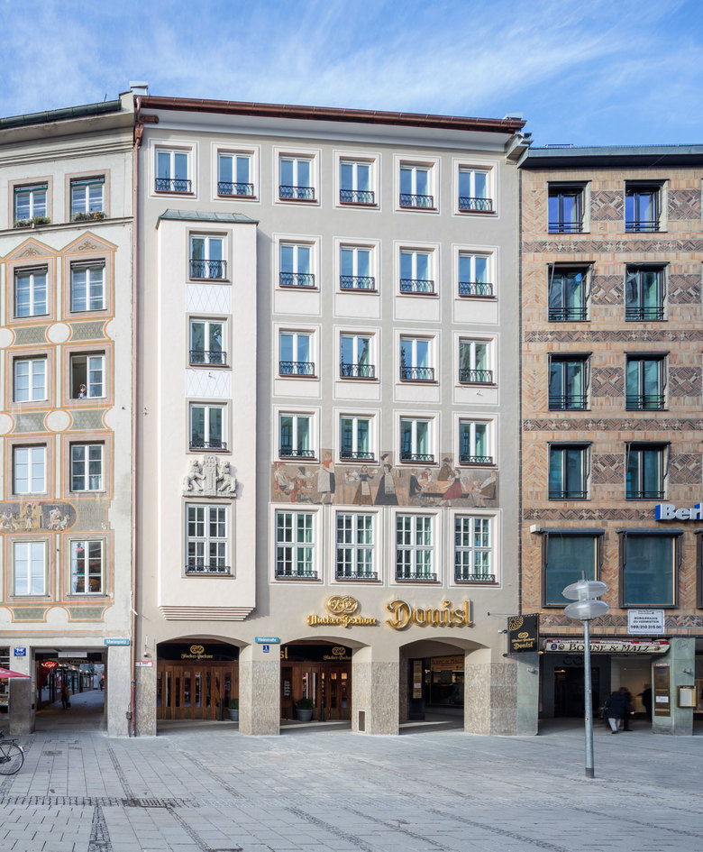 Im Jahr 1715 als „Bierwirtschaft am Markt“ eröffnet, ist der nach seinem einstigen Pächter Dionysius Haertl benannte „Donisl“ heute das älteste bestehende Wirtshaus Münchens. Im Zweiten Weltkrieg wurde das Gebäude vollständig zerstört und 1954 wieder aufgebaut. 1999 ging es in das Eigentum der Bayerischen Hausbau über, die sich 2012 zu einer Sanierung entschloss. Da die schlechte Bausubstanz der Traditionsgaststätte am Marienplatz einen Umbau nicht gerechtfertigt hätte, wurde sie bis auf die Fassade abgerissen und durch Hild und K Architekten komplett neu geplant. Nun öffnet sich gleich hinter dem holzgetäfelten Foyer ein weiter, geschossübergreifender Gastraum. Mit dem von Säulen umsäumten Innenhof, in den sich Sitznischen schmiegen, beziehen sich Andreas Hild, Dionys Ottl und Matthias Haber typologisch auf die Alt-Münchner Laubenhöfe. Diese erweitern den Stadtraum in das Gebäude hinein und schaffen so einen urbanen Innenraum inmitten des Hauses. Im München des 21. Jahrhunderts ist diese traditionelle städtische Bauweise fast verschwunden, ein erhaltenes Beispiel jedoch findet sich in unmittelbarer Nähe des Marienplatzes: Der prächtige Innenhof der Alten Münze, des Sitzes des Landesdenkmalamts.