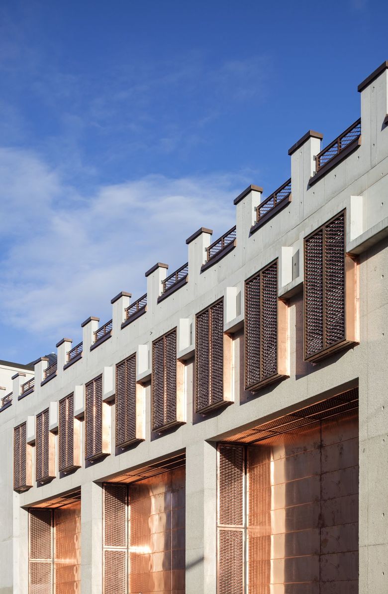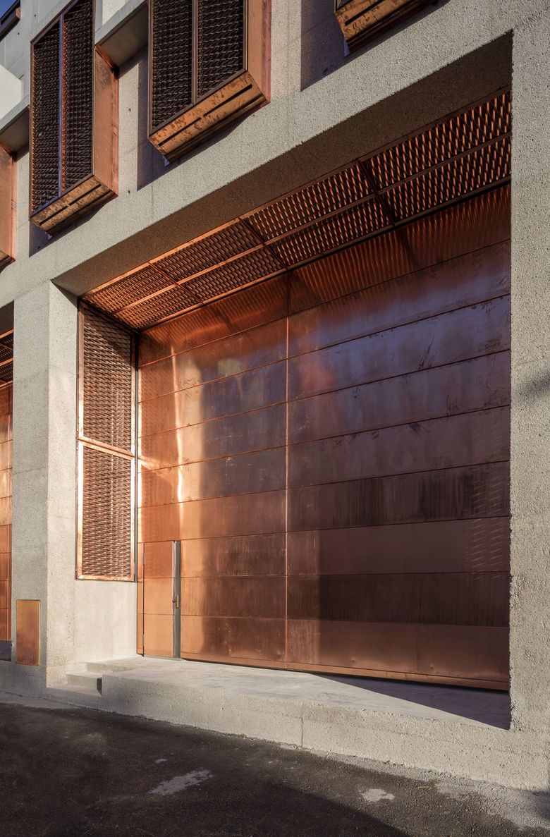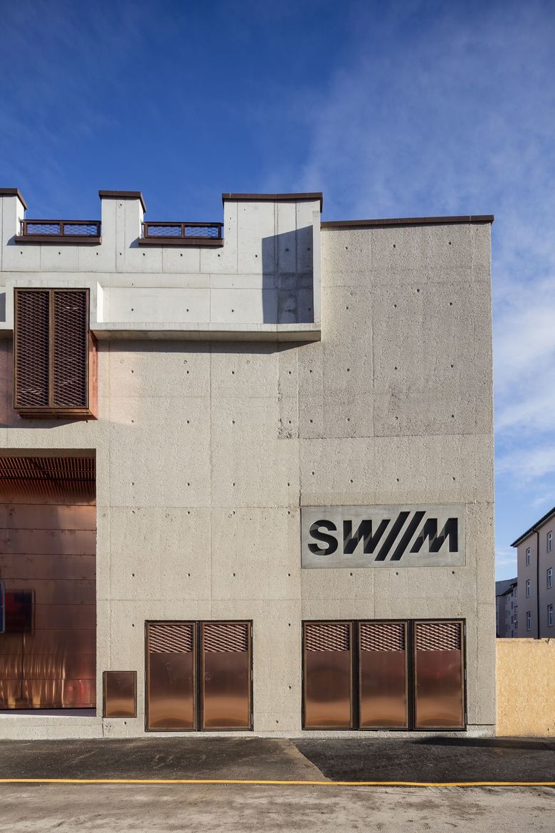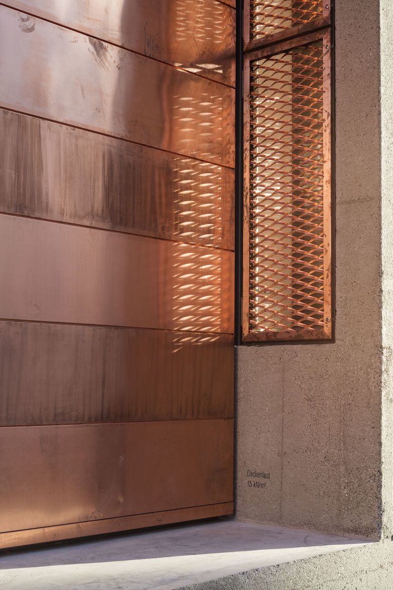 Die Fassade thematisiert in ihrer rauen Anmutung die Eigenart des Zweckbaus: Der roh belassene, massive Ortbeton trägt die Spuren des Fertigungsprozesses offen zur Schau. Drei große Einbringöffnungen für Transformatoren bestimmen die Gliederung der Hauptfassade. Sie sind durch eine reversible Kupferblech-Verkleidung geschlossen. Das aufgrund seiner hohen Leitfähigkeit in der Stromversorgung unentbehrliche Material wurde auch für die Türen, die großformatigen Streckmetallgitter der Lüftungsöffnungen, für Verkleidungen, Absturzsicherungen und Fallrohre verwendet. Die Analogie zur Funktion des Gebäudes liegt auf der Hand.