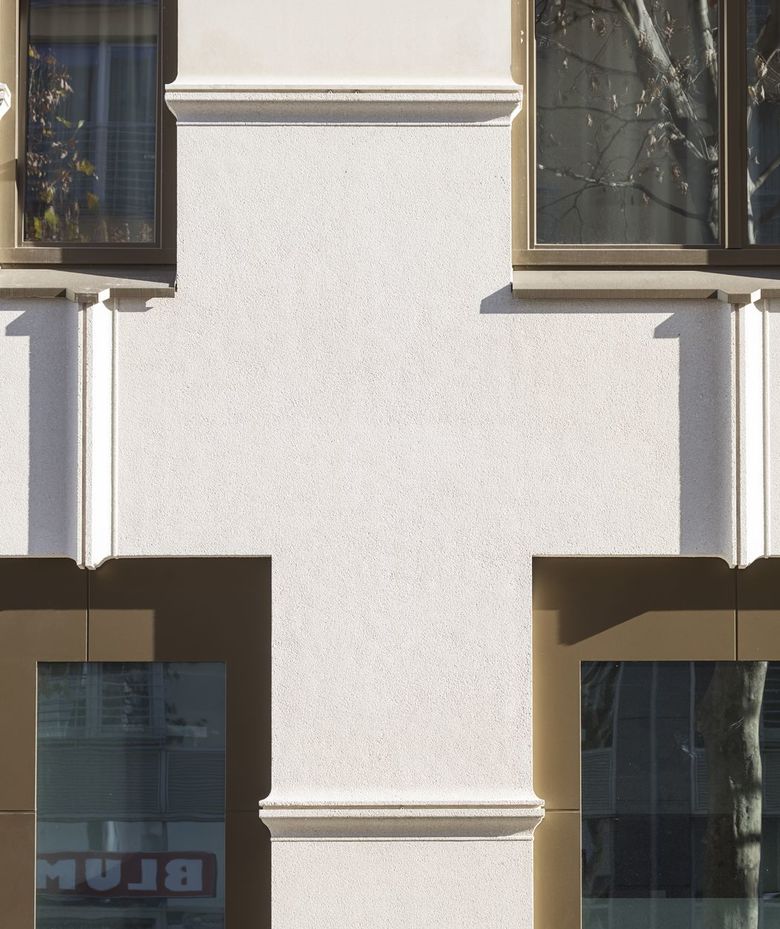 Fensterrahmen und –bleche aus Aluminium kontrastieren in ihrer dunkelbraunen, metallischen Pulverbeschichtung mit der ansonsten hellen Fassade und akzentuieren so zusätzlich den Rhythmus ihrer Gliederung. Die in Farbgebung und Materialität entsprechend gestaltete Fensterfront der Hotellobby im Erdgeschoss und der Haupteingang wurden in Anlehnung an die zuvor hier existierende Arkade deutlich zurückgesetzt. Noch außerhalb des eigentlichen Eingangsbereiches entsteht so ein geschützter Raum.