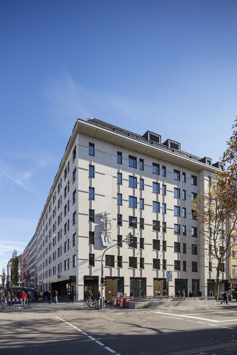 „Die Kunst der Fuge“ – Ein in unmittelbarer Nachbarschaft zum Münchner Hauptbahnhof gelegenes Verwaltungsgebäude aus den 50er Jahren, das zuletzt neben Imbissen und Billigläden unter anderem das Drogendezernat der Stadt beherbergt hatte, musste aufgrund seiner Baufälligkeit abgerissen werden. Der an seiner Stelle errichtete, von Hild und K Architekten im Auftrag der Bayerischen Hausbau GmbH & Co.KG geplante Neubau schließt die Blockrandbebauung an der Ecke zwischen Bayer- und Goethestraße erneut. Wer den Bahnhof nach Süden hin verlässt, läuft nun direkt auf das achtstöckige Hotel mit Gastronomie und Lobby im Erdgeschoss zu. Als Blickfang fungiert vor allem dessen ungewöhnliches Fassadenrelief. Das Gestaltungsprinzip, dem dieses folgt, lässt sich mit Andreas Hild, Dionys Ottl und Matthias Haber augenzwinkernd als „Kunst der Fuge“ bezeichnen.