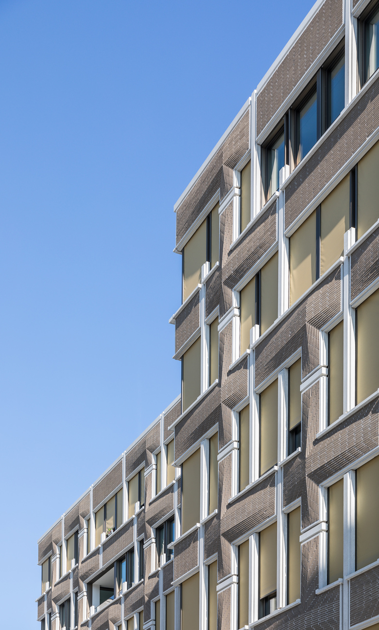 Entlang der zum neuen Quartier „Schwabinger Tor“ hinführenden Prachtstraßen findet man große historische, klinkerverkleidete Gebäude. Die Ziegel-„Puzzlestücke“ des Neubaus interpretieren diese lokale Tradition spannungsreich. Die Stahlbetonfertigteile mit eingelegten Klinkerriemchen sind verbunden durch Passstücke aus hellem, gesäuertem Beton. Im Bereich der horizontalen Stöße lassen sich diese als kleine Kapitelle auffassen, in vertikaler Richtung werden sie als Lisene zwischen den Fenstern fortgeführt. Die konstruktiv unvermeidbaren Fugen sind damit zu einer Art Ornament überhöht. Fensterbrüstungen und –bretter sowie die Verkleidung der Stützen im Erdgeschoss sind in Beton gleicher Färbung ausgeführt und fügen sich damit ins Gesamtbild ein. Die konsequente Verwendung des kreuzförmigen Fertigteils bringt mit sich, dass mehrere Räume eine Übereck-Verglasung erhalten, welche zugleich eine mehrseitige Orientierung ermöglicht.