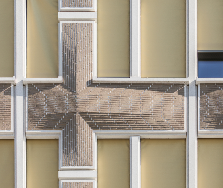 Fassadenreliefs beschäftigen das Büro Hild und K bereits seit vielen Jahren. Häufig orientieren Andreas Hild, Dionys Ottl und Matthias Haber sich dabei an textilen Strukturen. Für das „Geschäfts-, Büro- und Wohnhaus Schwabinger Tor“ haben sie nun eine Außenhülle aus klinkerverkleideten Betonfertigteilen geschaffen, die sich wie ein Brokatüberwurf über alle Stockwerke legt. Nach Art einer Reliefstickerei treten einzelne Steine aus der Fassadenebene hervor. Das sternförmige Muster, in dem die Ziegel angeordnet sind, verdeutlicht deren nichttragende Funktion. Gleich einem Gobelin bedeckt die vorgehängte, hinterlüftete Fassade die eigentliche Konstruktion.