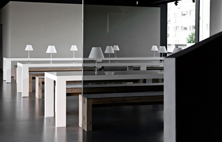 Reduziert auf ein Spiel mit Schwarz und Weiß setzt sich der Kontrast durch den Gebrauch von verschiedenen Materialien fort. Fugenlose anthrazitfarbene Böden und hochglanzlackierte Oberflächen stehen im Kontrast zu weichen Stoffen und wechselnden Farbakzenten. Hölzerne Sitzbänke mit Filzauflagen im Aufenthaltsbereich setzen einen warmen und weichen Akzent zu der klar strukturierten räumlichen Ordnung.