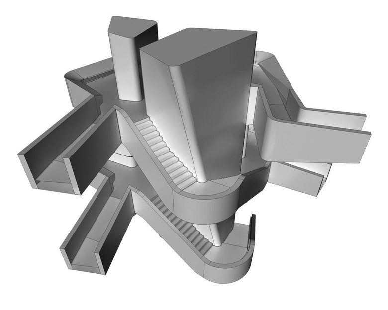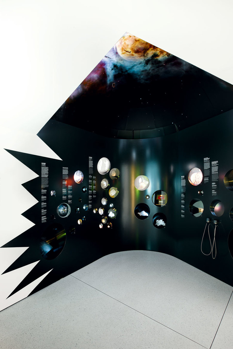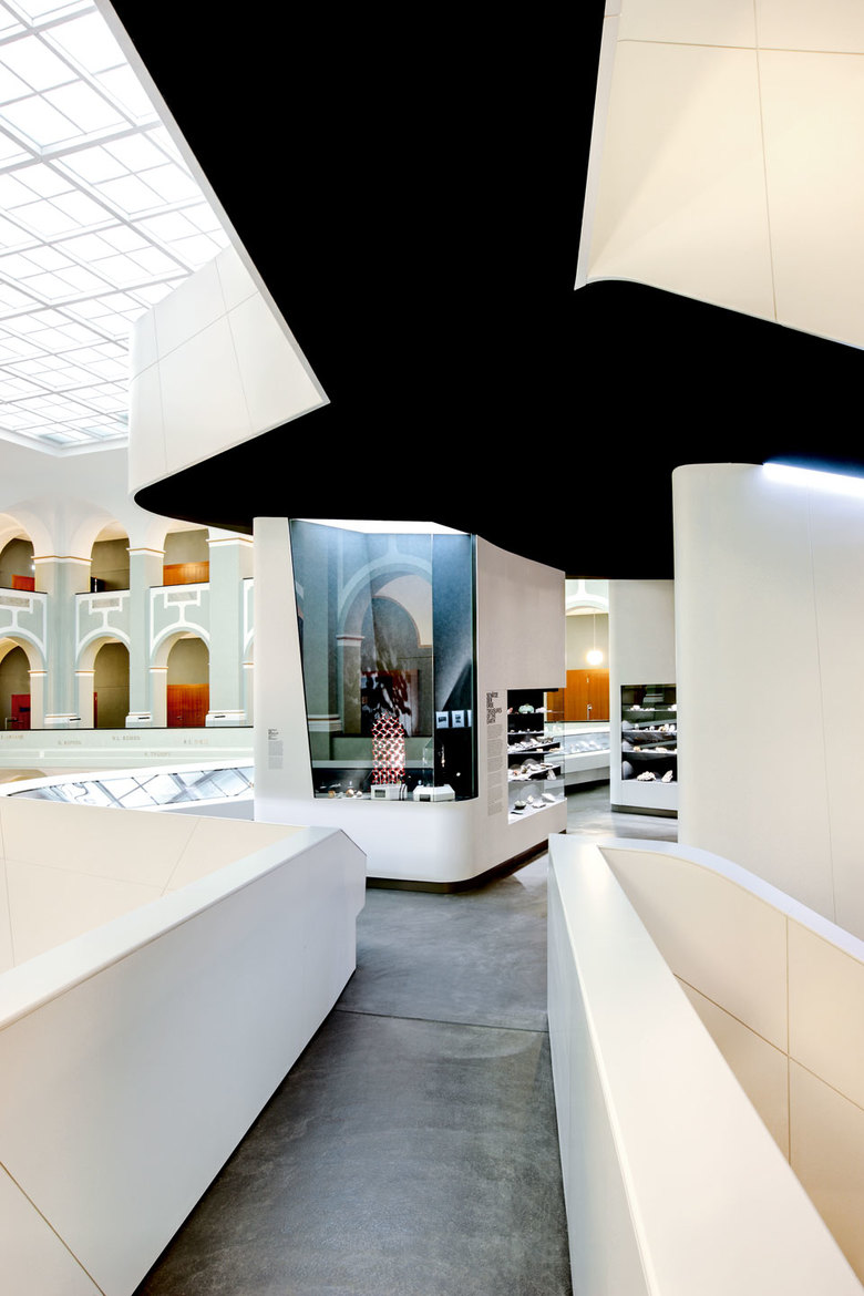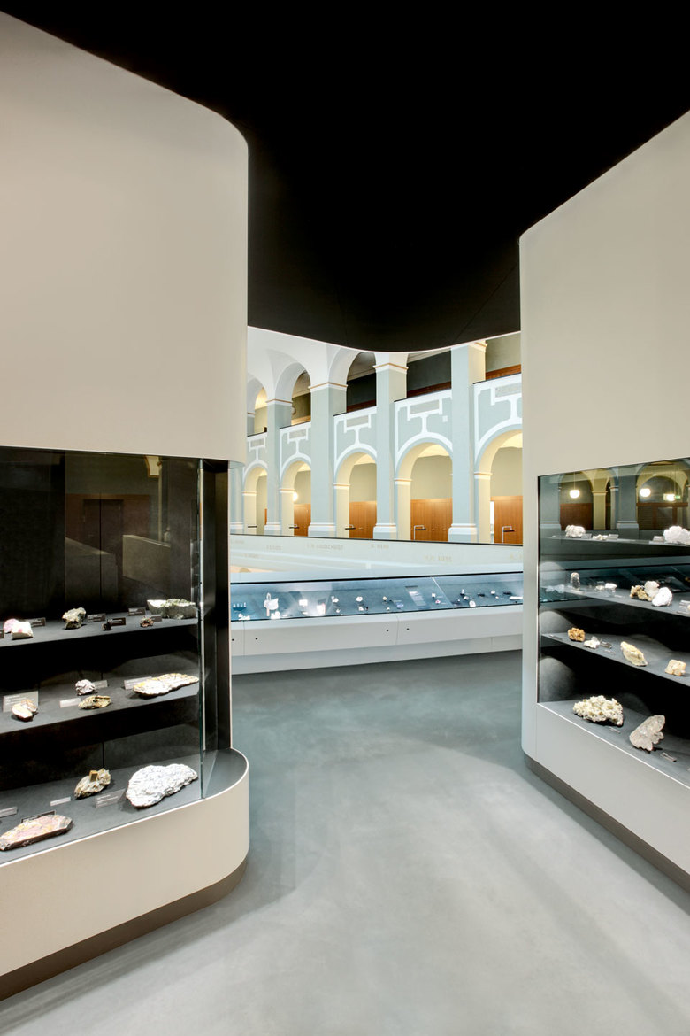 Herzstück der Ausstellung ist ein offener Ausstellungsturm im gedeckten Lichthof, der sich selbstbewusst vom neu renovierten, historischen Gebäude absetzt und einen Dialog zwischen alt und neu provoziert. In Analogie zu den Kräften, die im Inneren der Erde wirken, schraubt er sich spiralförmig über drei Geschosse bis unter die Lichtdecke des Innenhofs. Die Struktur der Ausstellung folgt jener der Schichtung der Erde. Eine um den Turm laufende Treppe und durchgehende Brüstungsbänder verbinden die drei Ebenen miteinander und führen den Besucher durch die faszinierenden „Schichten“ der Erde: von den dynamischen Prozessen (Dynamik der Erde) in ihrem Inneren, zu den unter der Oberfläche verborgenen Schätzen (Schätze der Erde) bis zu den faszinierenden Archiven (Archive der Erde), die seit unendlichen Zeiten in ihren Sedimenten konserviert sind.