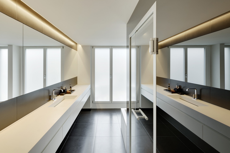 Der hohe Kontrast zwischen schwarz und weiss prägt die Atmosphäre des Raumes und verleiht im eine grosse Abstraktion. Geschwungene Linien für Beleuchtung und Raumteiler an der Decke ziehen sich wie bewegte Spuren durch den Raum.