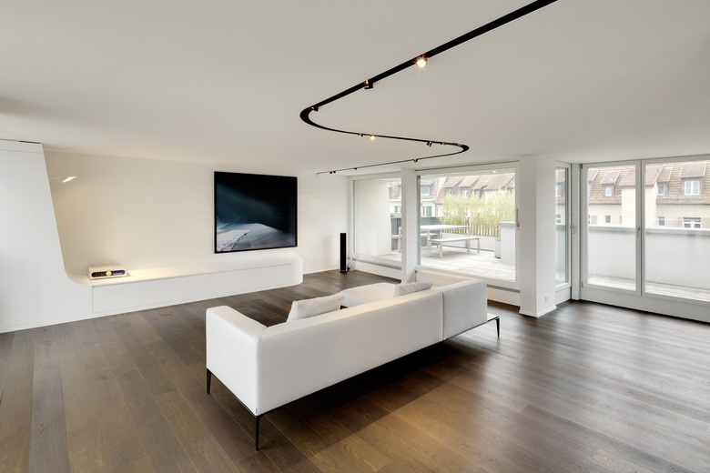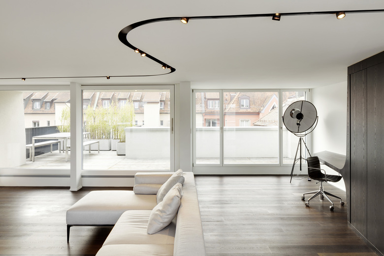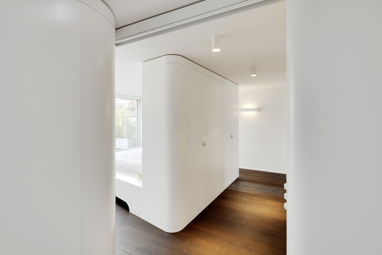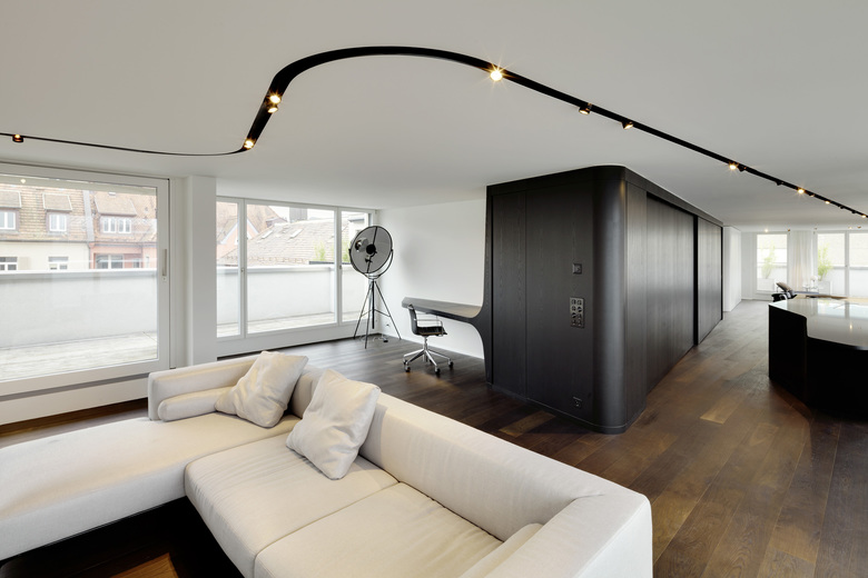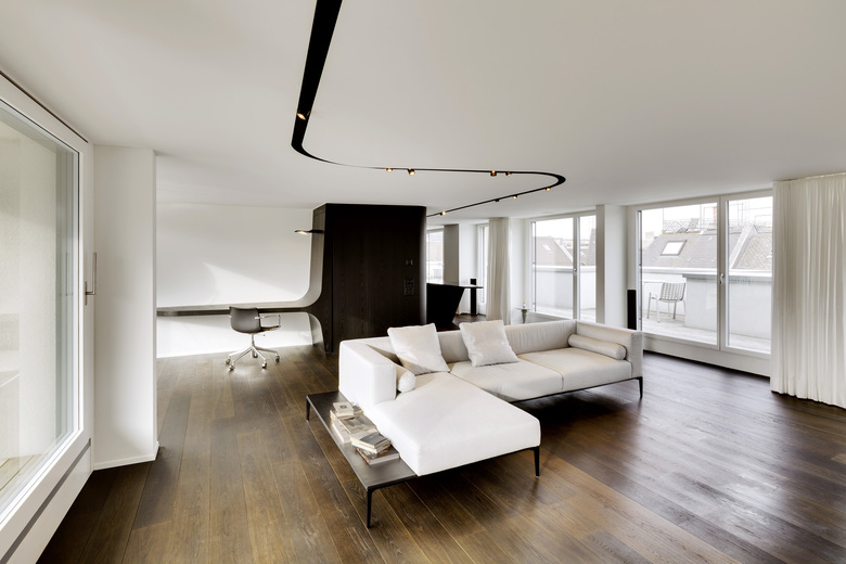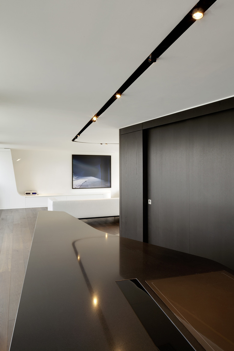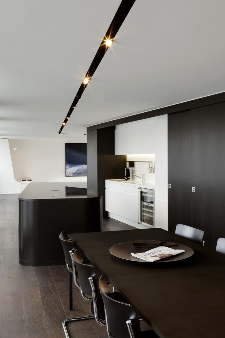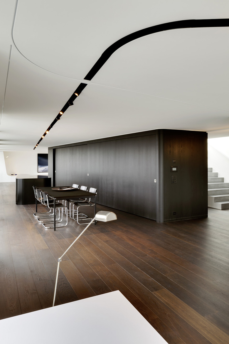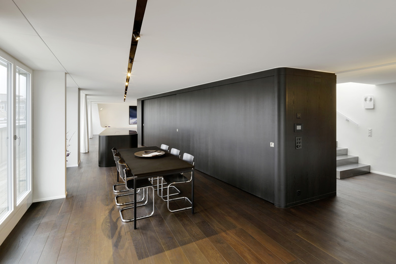 Das nach allen Seiten offene Penthouse ist als grosszügiges Raumkontinuum geplant. In der Mitte des Grundrisses befindet sich ein multifunktionaler Kern mit Küche, Reduits und Arbeitsbereich, der sich je nach Gebrauch öffnen und schliessen lässt. Der Fussboden als verbindende Fläche und der innenliegende Kern sind aus dunklem Holz, die Decke und Wände in der Farbe weiss gestaltet.