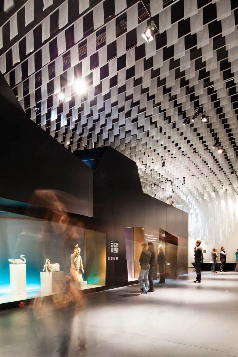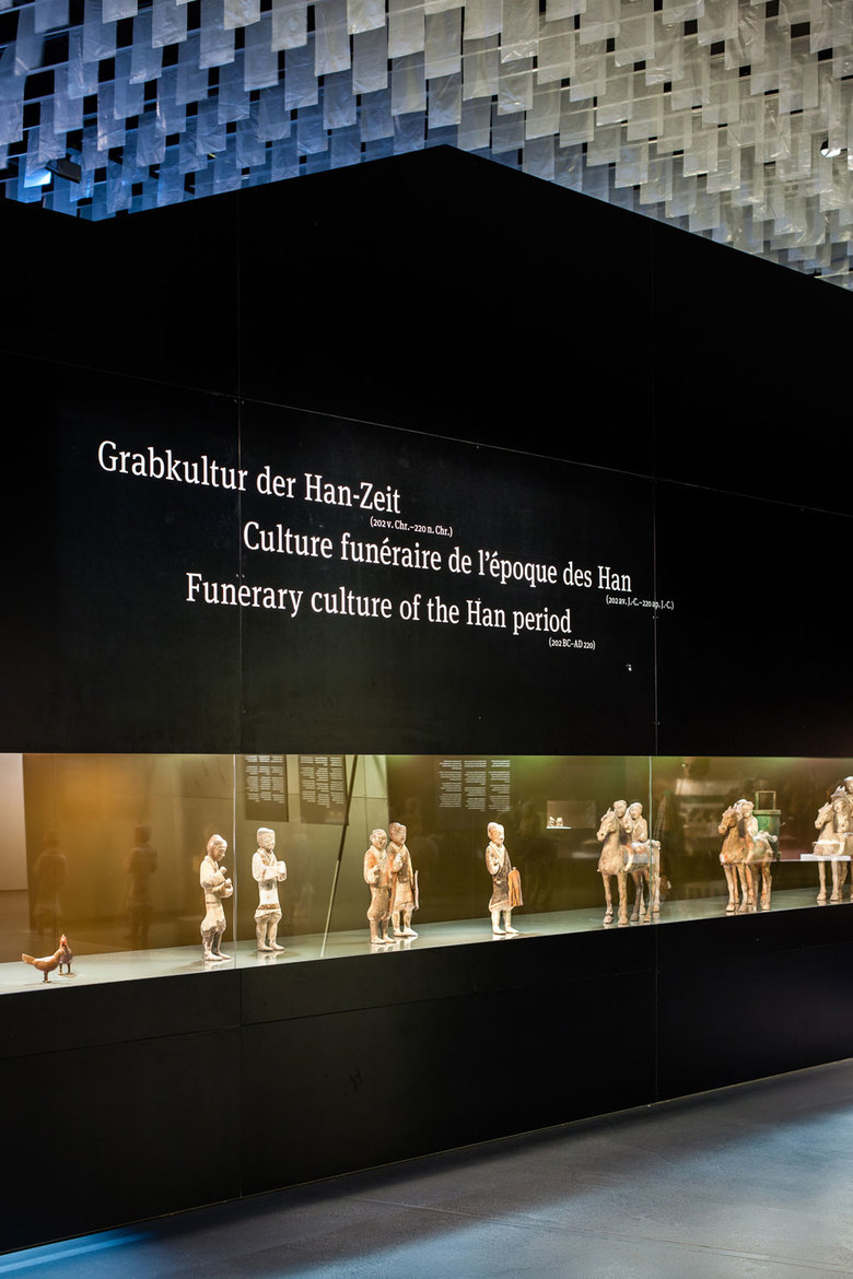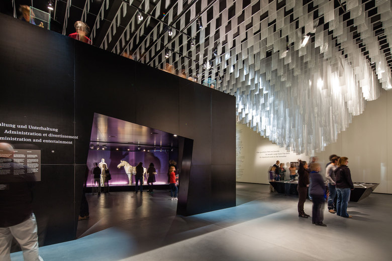 Der zentrale, in tiefes Schwarz getauchte Ausstellungskörper abstrahiert das Grabmonument Qin Shi Huangdis. Die Geometrie des Körpers unterstützt die thematischen Bezüge zu den Ausstellungsinhalten: Die Neigungen der Rampenfläche unterstreichen Leben und Aufstieg des Ersten Kaisers, die Errichtung eines einheitlichen chinesischen Kaiserreiches sowie seinen Tod.