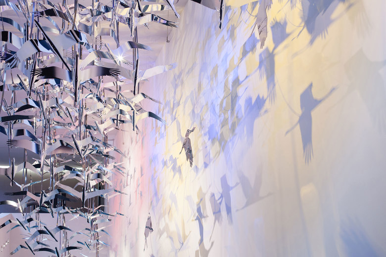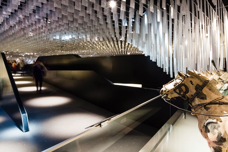 Die schimmernde Auftaktinstallation fliegender Kraniche – chinesisches Symbol des ewigen Lebens – empfängt den Besucher. In der Ausstellung veranschaulichen 8000 silberfarbige Fahnen die enorme Anzahl der Krieger der Terrakottaarmee des Ersten Kaisers. Sie erscheinen gleich einem glitzernden Quecksilberstrom und symbolisieren so das Elixier der Unsterblichkeit.