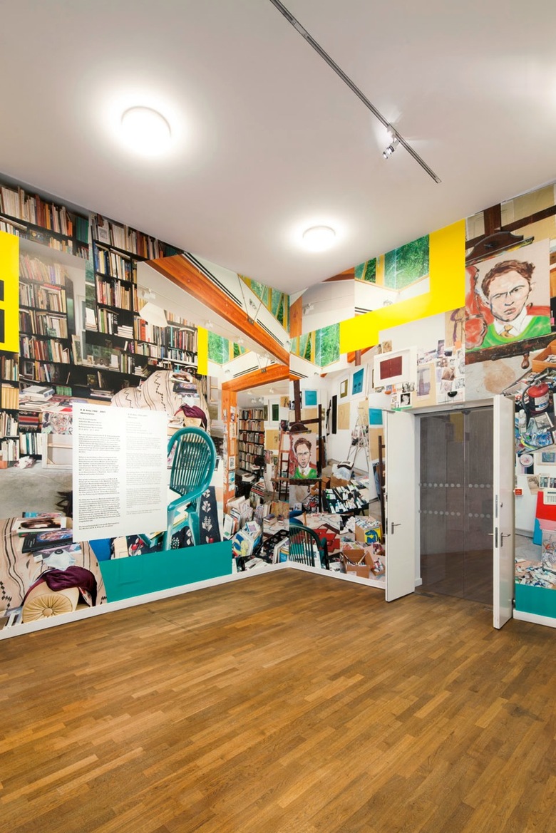 Eine großformatige begehbare Fotoinstallation im Treppenhaus zeigt Kitajs Atelier in Los Angeles und lädt ein in die Welt des Künstlers einzutauchen. In den Ausstellungsräumen steht die Wirkung der Bilder mit ihren kräftigen Farben und collagenhaften Kompositionen im Fokus. Punktuell angeordnete Tische erläutern Hintergründe zu den Ausstellungskapiteln und zeigen Quellenmaterial zu ausgewählten Bildern.