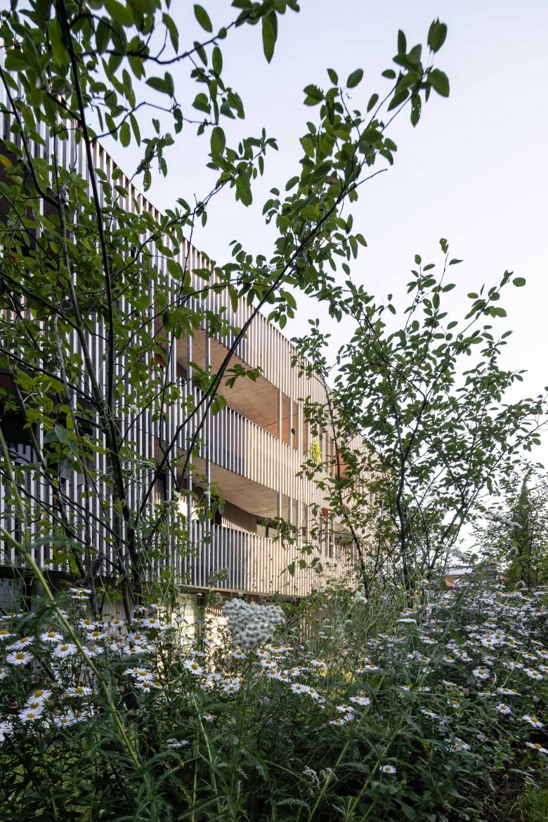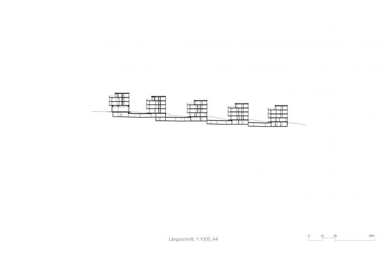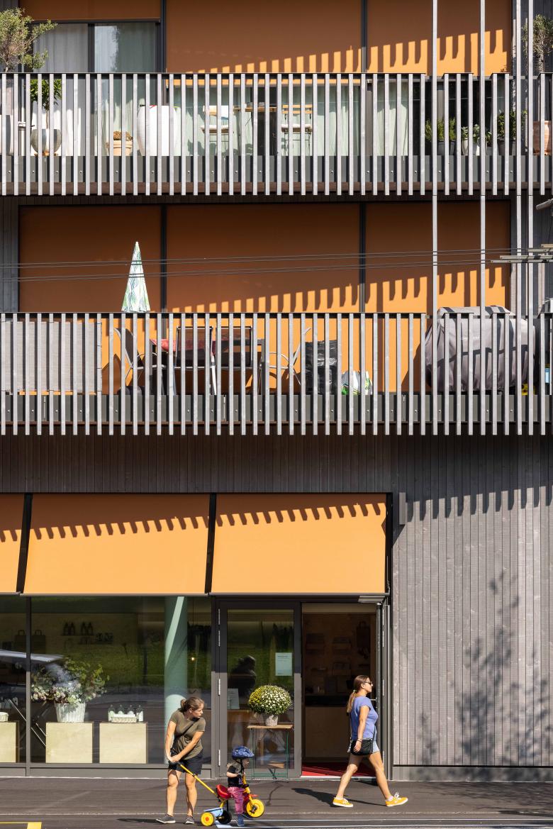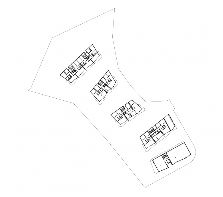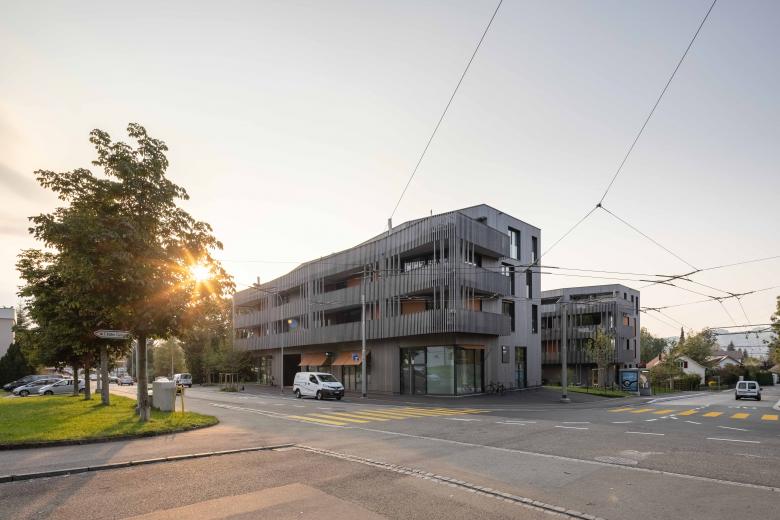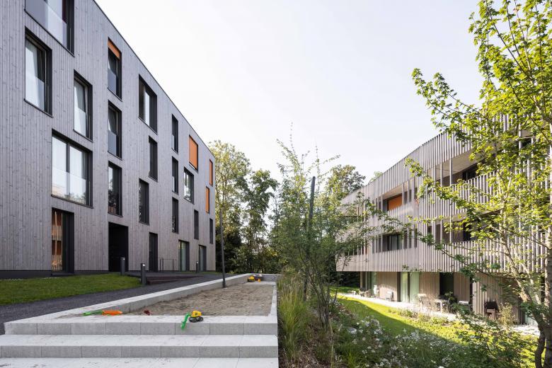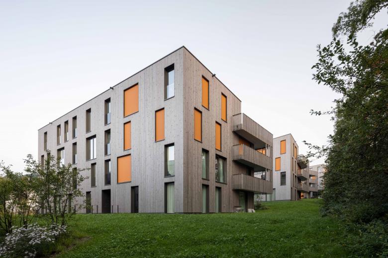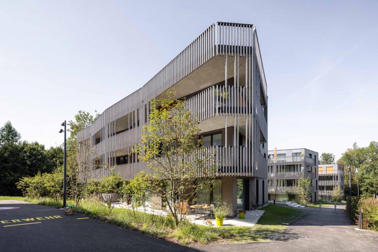 Den Auftakt der Anlage bildet das Haus an der Wolfgangstrasse, in dessen Erdgeschoss sich ein Gewerbebereich mit flexibler Raumgestaltung für unterschiedliche Nutzungsszenarien befindet. Die anderen vier Gebäude sind ausschliesslich der Wohnnutzung vorbehalten. Die insgesamt 60 Wohnsegmente der Anlage mit vielfältigen Grundrissen sind allesamt mit grosszügigen, offenen Wohnbereichen, entsprechend angelagerten Balkon- oder Gartenflächen sowie klar abgegrenzten Schlafräumen konzipiert. Die dezente Polygonalität der Wohnhäuser vermittelt eine spielerische Leichtigkeit, die durch die harmonisch versetzte Anordnung und die filigrane Holzfassade betont wird.