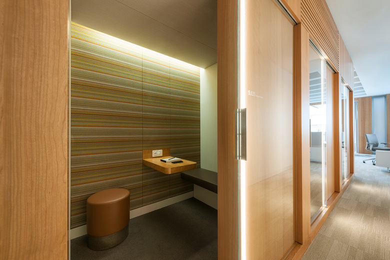 In entgegengesetzter Richtung zur Rippendecke hängen feine Lichtprofile im Raum und bringen blendfreies, weiches Licht in den Raum. Modular aufgebaut, aus mikroprismatischem Kunstglas hergestellt und mit hocheffizienten Energiewerten unterstützen sie subtil die Bürowelt. Zusätzlich eingesetzte Arbeitsplatzleuchten lassen sich individuell steuern.