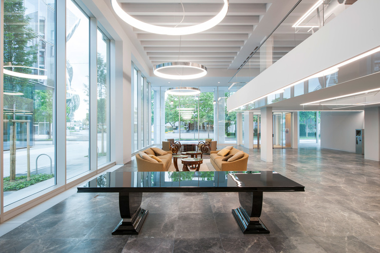 Licht begleitet die vom Erdgeschoss bis ins Dach platzierte, vertikale Raumskulptur von Juan Navarro Baldeweg. Diese an der Deckenstirne präzis gesetzte Lichtlinie schlängelt sich nahtlos dem Himmel entgegen und umfasst die Skulptur. Das Licht fällt weich in den Luftraum zurück und inszeniert das Kunstwerk selbstverständlich. Die reine LED-Lösung der eingesetzten Rund 200 Laufmeter Lichtband überzeugt durch die hohe Lichtqualität.