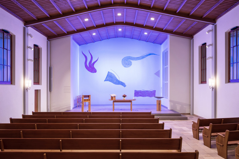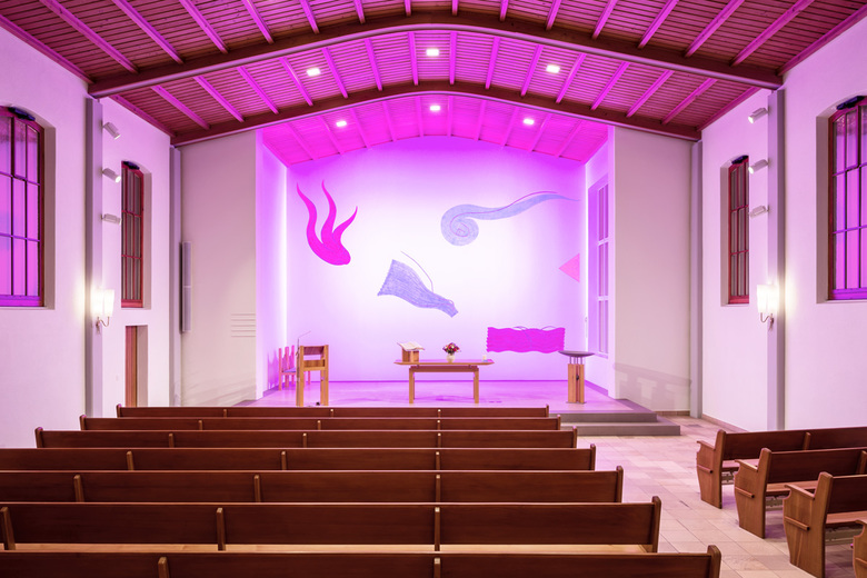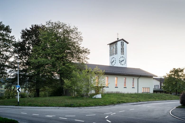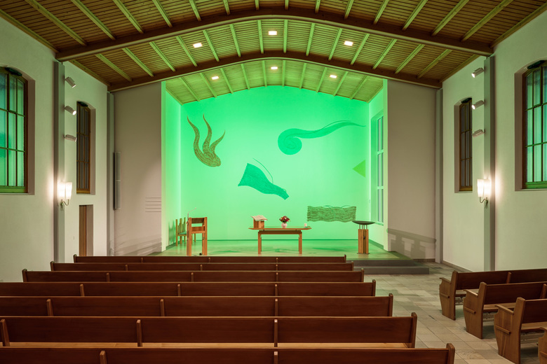 Die grossflächigen Pendelleuchten geben dem Gemeindesaal eine besondere Bedeutung und inszenieren ihn würdevoll, lassen aber auch verschiedene Raumnutzungen zu. Glasaufbauleuchten, in der Art wie Alvar Aaltos Leuchten in der Bibliothek in Viipuri verleihen dem Foyer und der Sakristei eine festliche und stimmungsvolle Atmosphäre, die gleichzeitig Ruhe ausstrahlt.