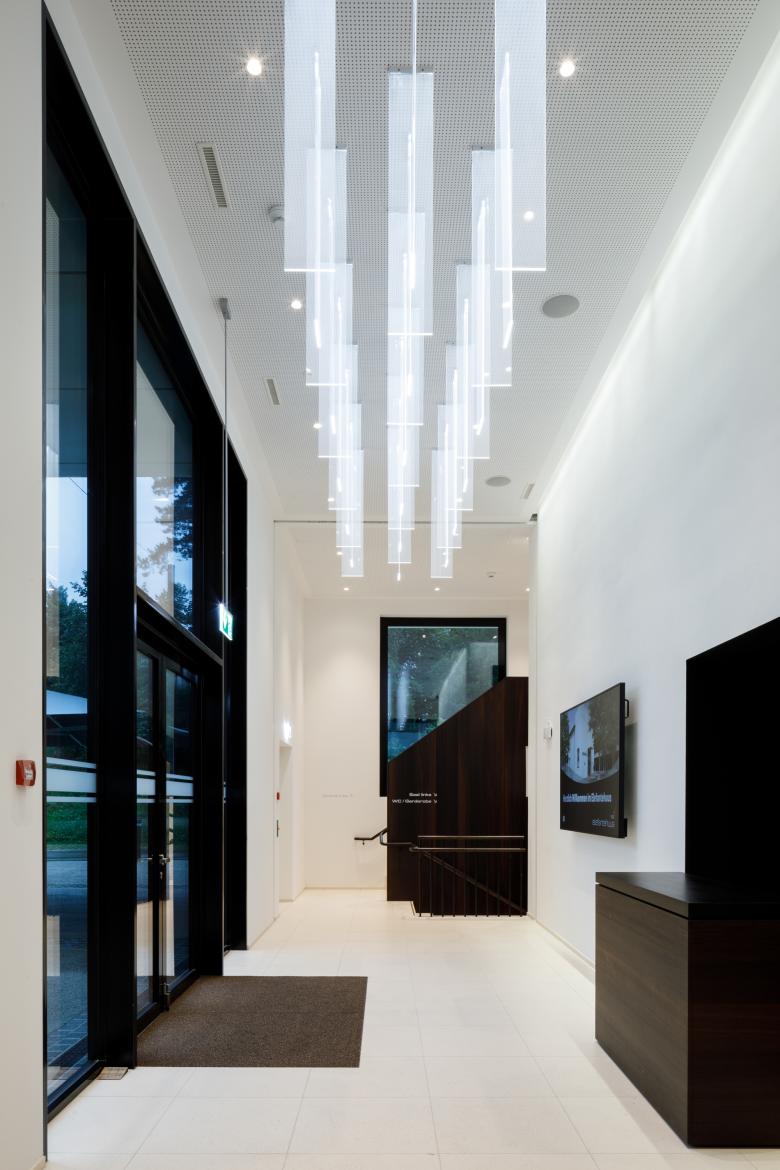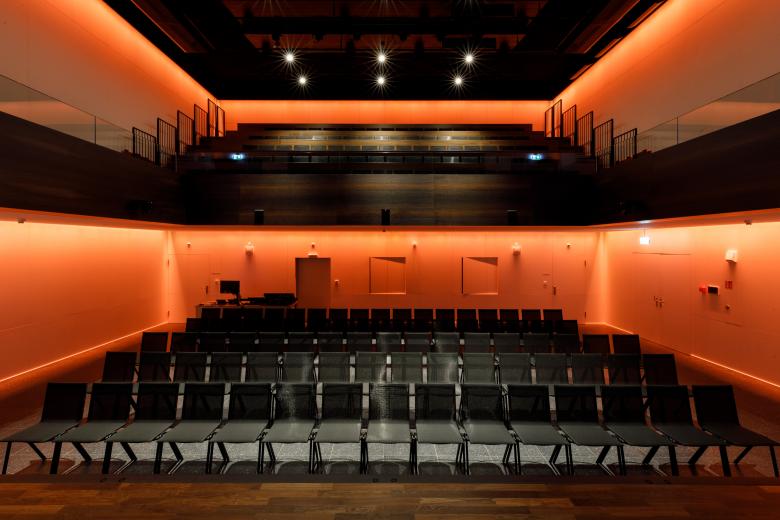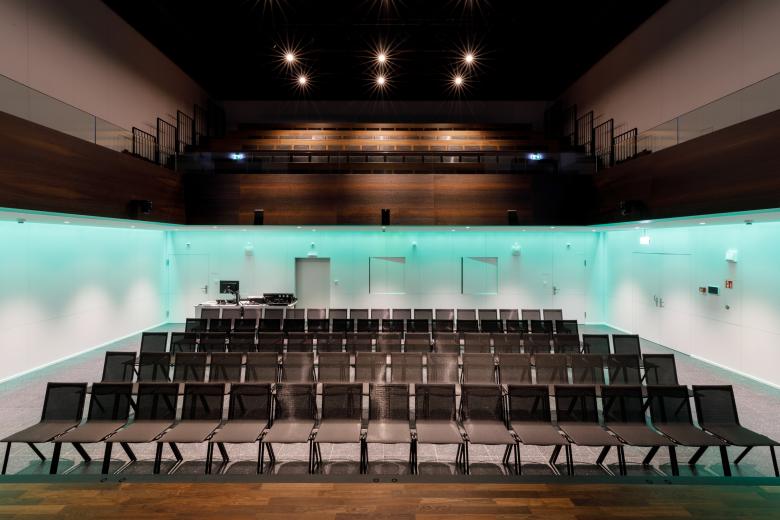 Der Veranstaltungssaal ist der Raum, in dem die Hauptaktivitäten stattfinden. Es handelt sich um einen zweistöckigen, geschlossenen Raum ohne Tageslicht-Öffnungen mit weißen Wänden, dunkler Decke und Holzfußboden. Ziel der Beleuchtung ist es, den Raum visuell zu erweitern und über die Bespielung der weissen Wände verschiedene Lichtstimmungen zu erzeugen. Die RGBW-Wandfluter sind umlaufend auf beiden Ebenen des Saals angeordnet. Der Lichtkegel dieser Lichtlinien ist sehr schmal, so dass das Licht nicht auf das Publikum fällt. Die Grundbeleuchtung erfolgt über Deckenfluter, die ebenfalls als RGBW-Farbwechsler für eine hohe Flexibilität in der Lichtstimmung sorgen. Die gesamte Innenbeleuchtung ist farbveränderlich (RGBW-Licht) und es gibt definierte Lichtszenen, die vom Nutzer ausgewählt und überschrieben werden können. Die Steuerung erfolgt über einen Touchscreen für die Alltagsnutzung oder ein umfangreiches Lichtmischpult, für die Lichtsteuerung bei Anlässen. Unter der Empore sorgen Einbaustrahler für die Grundbeleuchtung vor der Cateringzone.