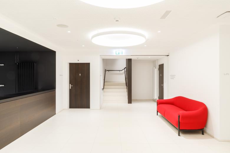 Im Untergeschoss befinden sich die Garderobe, die Toiletten und der Backstage-Bereich. Zwei große Ringleuchten mit Lichtkanten sind sehr nah an der Decke aufgehängt und schaffen eine großzügige Atmosphäre vor der Garderobe, die sonst ein blinder Raum wäre. Die Strahler für die Grundbeleuchtung haben glatte Oberflächen und zurückgesetzte Reflektoren, so dass sie mit der Decke verschmelzen. In den Toiletten und im Backstage-Bereich, die einen privateren Charakter haben, wurden hochwertige Anbauleuchten mit Glaslinsen eingesetzt, die den hochwertigen Innenausbau widerspiegeln.