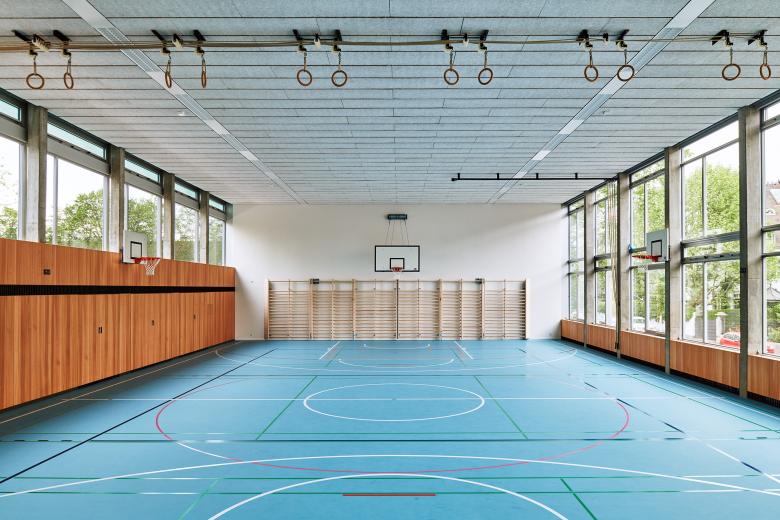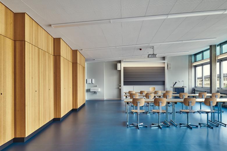 Die Schulzimmerbeleuchtung, ehemals nur ein Lichtband, besteht neu aus drei Lichtbändern. Diese in der Deckenneigung 90° zur Fassade platzierten Bänder fügen sich in der Decke ein und tragen mit einem feinen Indirektanteil zur Aufhellung der Decke bei.
