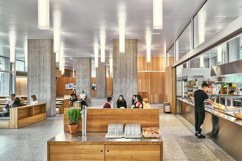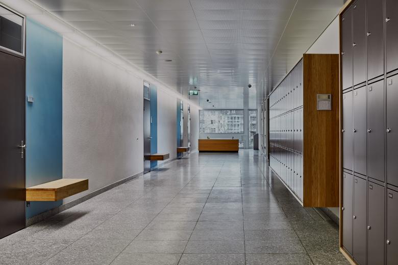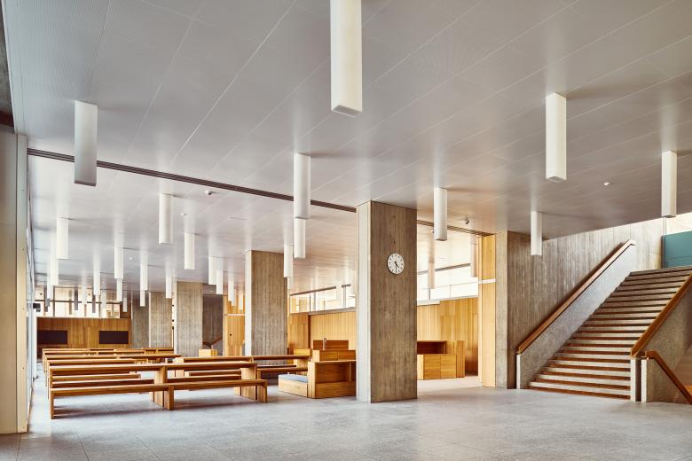 Im Erdgeschoss sind als Lichtelemente ausgebildete Lichtkörper vertikal in der Decke platziert und bringen weiches, schattenarmes Licht in den Raum. Bereits im Windfang beginnend, laufen die Leuchten über die Mensa bis in den Verwaltungsbereich weiter und verbinden diese Räume visuell.