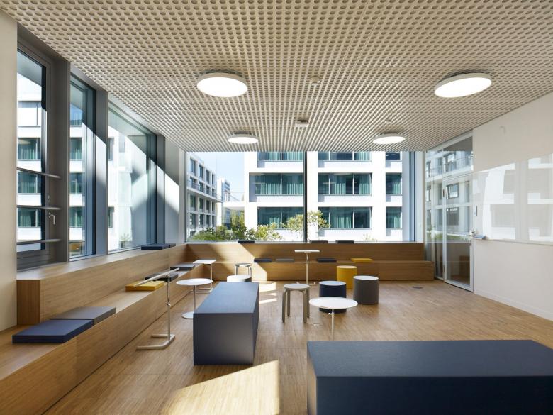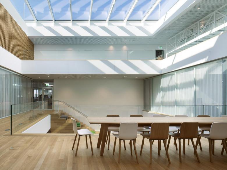 Vier unterschiedlich gestaltete Innenhöfe belichten die Gebäude natürlich. Die Anordnung der Treppen und Aufzüge unterstützt die vertikale Bewegung und fördert die zufälligen Begegnungen. Die wechselnde Lichtstimmung des Tageslichtes ist mit «inneren Fenstern» ergänzt. Diese an den Deckenstirn platzierten, textilen Lichtflächen bringen bis ins Erdgeschoss weiche und feine Lichtstimmungen. Fast nicht wahrnehmbar als Leuchten sind sie Teil der Architektur und fügen sich haptisch in das Gesamte ein.